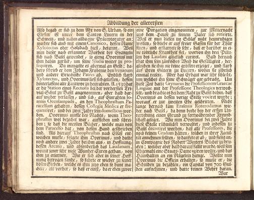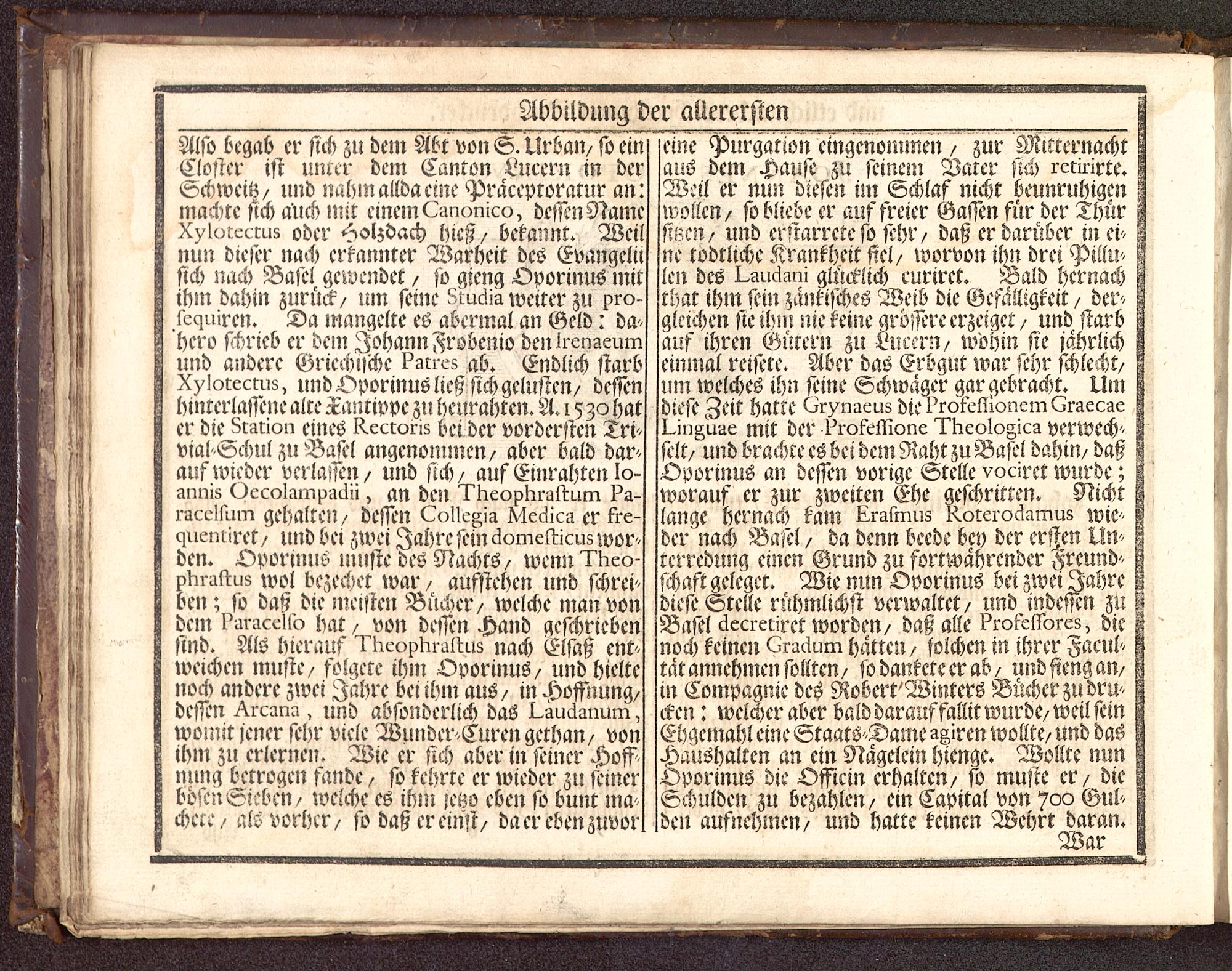 Also begab er sich zu dem Abt von S. Urban/ so einCloster ist unter dem Canton Lucern in derSchwcitz/ und nahm allda eme Pracevtoramr an:machte sich auch mit einem Lmionico, dessen NameXylutcc.tus oder Holzdach hieß/ bekannt. Weilnun dieser nach erkannter Warheit des Evangelttsich nach Base! gewendet / so gieng Oporinus lnitihm dahin zurück/ !im seine ^uciia weiter zu pro-schüren. Da tnangelte es abermal an Geld: da^hero sHrieb er dem Johann Frobenio denircnaeumund andere Griechische k^u-es ab. Endlich starbXylorccms, und Oporinus ließ sich gelüsten/ desienhtnterlasiene alte ^aiuippe zu beurahten. A. 15^ hater die^mrion eines Kecroris bei der vordersten Twvial^vchul zu Basel angenoznmen/ aber bald dar-auf wieder verlaUn/ und sich/ aus Einrahtcn I0-