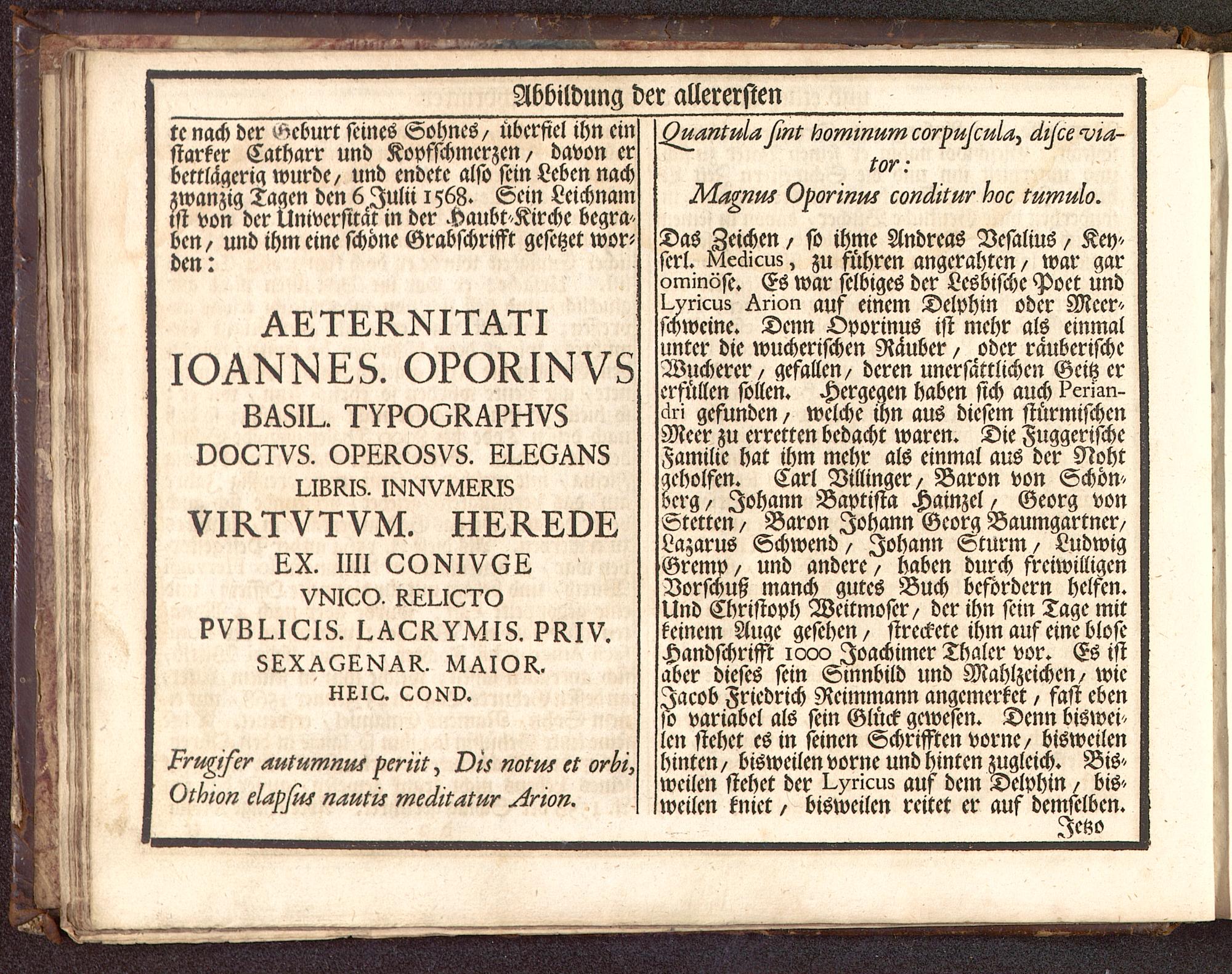 Das Zeichen / so ihme Andreas Vesalms / Key,serl. ^leäicus, zu führen angerahten / war garominöse. Es war selbiges der Lesbische Poet undI^vricus ^rion auf einem Delphin oder Meer-schwcine. Denn Oporinus ist mehr als einmalunter die wucherischen Räuber / oder räuberischeWucherer / gefallen/ deren unersättlichen Geitz ererfüllen sollen. Hergegen haben sich auch I^ei-wn-6ri gefunden / welche ihn aus diesem stürmischenMeer zu erretten bedacht waren. Die FuggerifcheHamtltc hat ihm mehr als einmal aus der Nohtgeholfen. Carl Villinger/ Baron von Schönaöerg/ Johann Baptista Hainzel/ Georg vonStetten / Baron Johann Georg Baumgartner/Lazarus Schwend/ Johann Sturm / LudwigGremp / und andere / haben durch freiwilligenVorschuß manch gutes Buch befördern helfen.Und Christoph Wettmofer/ der ihn fein Tage mitkeinem Auge gesehen/ streckete ihm auf eine blofeHandfchriffr ivcx) Joachimer Thaler vor. Es istaber diefes fein Smnbild und Mahlzeichen / wieJacob Friedrich Retmmann angemerket / fast ebenso variabel als fein Glück gewesen. Denn biswei,len stehet es in seinen Schrifften vorne/ bisweilenhinten / bisweilen vorne und hinten zugleich. Bis>weilen stehet der I^ricus auf den: Delphin / bis'weilen kniet / bisweilen reitet er auf demfelben.