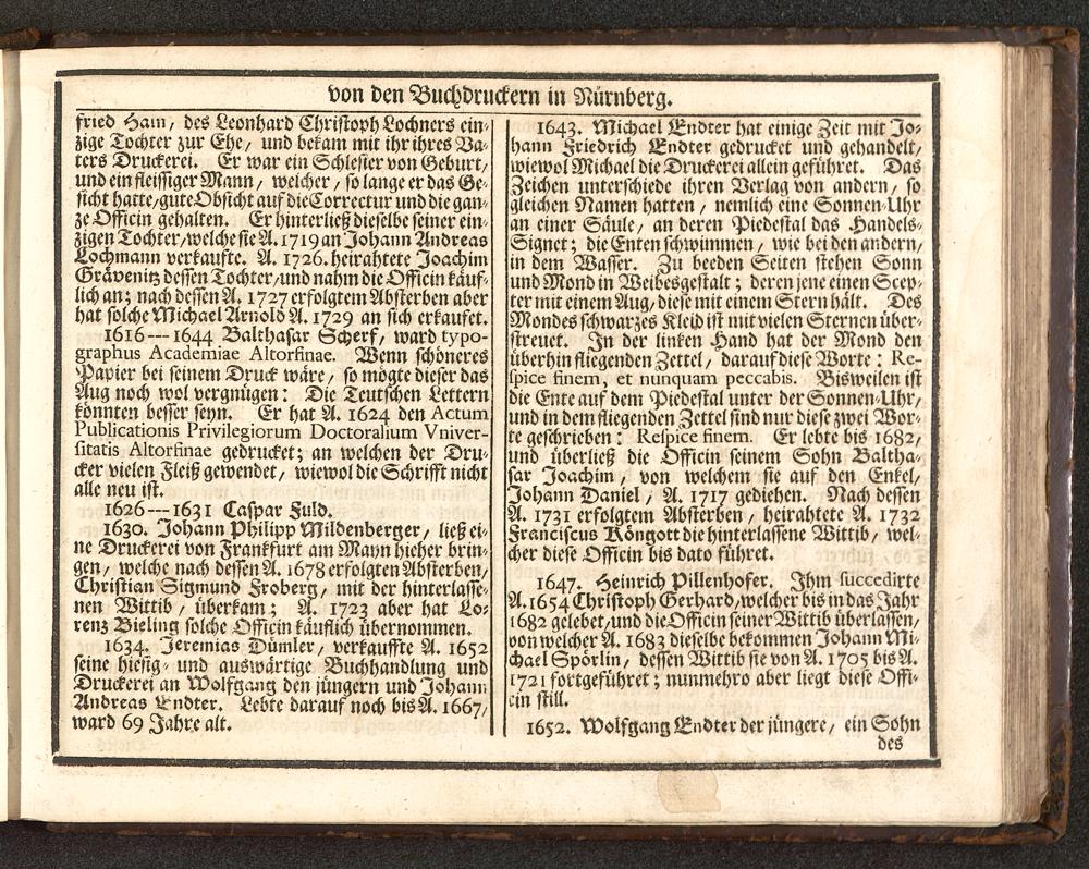 164z. Michael Andrer hat einige Zeit mit 'Jo-hann Friedrich Endter gedrucket und gehandelt/wiewol Michael die Druckerei allein gefuhrer. DasZeichen unterfchiede ihren Verlag von andern/ sogleichen Namen hatten / ncmlich eine Sonnen Uhran einer Säule/ an deren Pledcstal das HandelstSignet; die Enten schwimmen^ wie bei den andern/in dem Wasser. Zu beeden betten stehen Sonnund Mond in Weidesgestalt; deren jene einen Scev>ter mir einem Aug/ diese mir einen: Srern hält. DesMondes schwarzes Kleid ist mitvtelen Sternen über-streuet. In der linken Hand hat der Mond denüberhtn fliegenden Zettel/ daraufdiefe Worte: