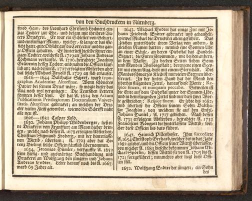 die Ente auf den: Piedestal unter der Sonnen-Uhr/und in dem fliegenden Zettel sind nur diefe zwei Wol>te gefchrtcben: KcipiceKnem. Er lebte bis 1682/und überließ die Officin feinem Sohn Laltha,sar Joachim, von welchem sie auf den Enkel/Johann Daniel / A. 1717 gediehen. Nach dessenA. 17Z1 erfolgtem Absterben / hetrahtetc A. 17Z2Franciscus Nöngottdtehinterlassene Wittib/ webcher diese Officin bis dato führet.
