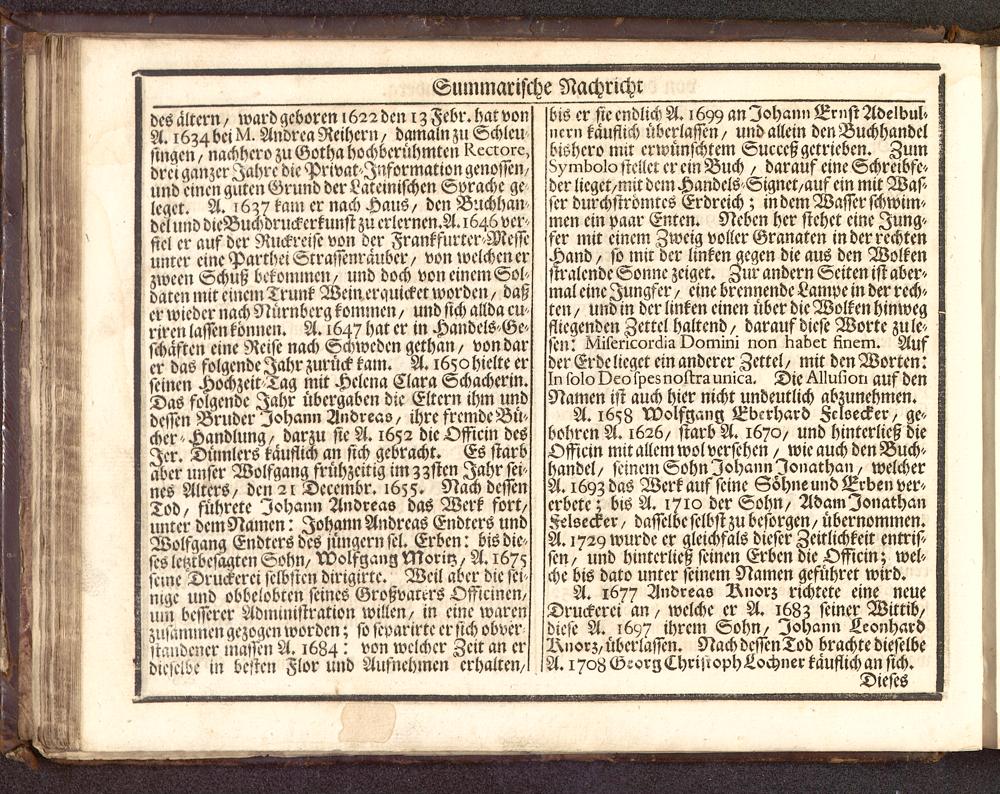 bis er ste endlich A. 1699 an Johann Ernst Adelbul»ncrn kauflich überlassen/ und allein den Buchhandel 'bishcro mit erwünschtem ^ucceß getrieben. Zum8^mb0w stellet er ein Buch / darauf eine Schreibstder lieget/mit dein Handels Signet/auf ein mit Was-ser durchströmtcs Erdreich; in dem Wasser ftbwim» Imen ein paar Enten. Neben her stehet eine Jung/fer mit einem Zweig voller Granaten in der rechten zHand / fo mir der linken gegen die aus den Wolkenstralende Sonne zeiget. Zur andern Seiten ist aber»mal eine Jungfer/ eine brennende Lampe in der rech»ten / und in der linken einen über die Wolken hinweg sfliegenden Zettel haltend/ darauf diese Worte zule»