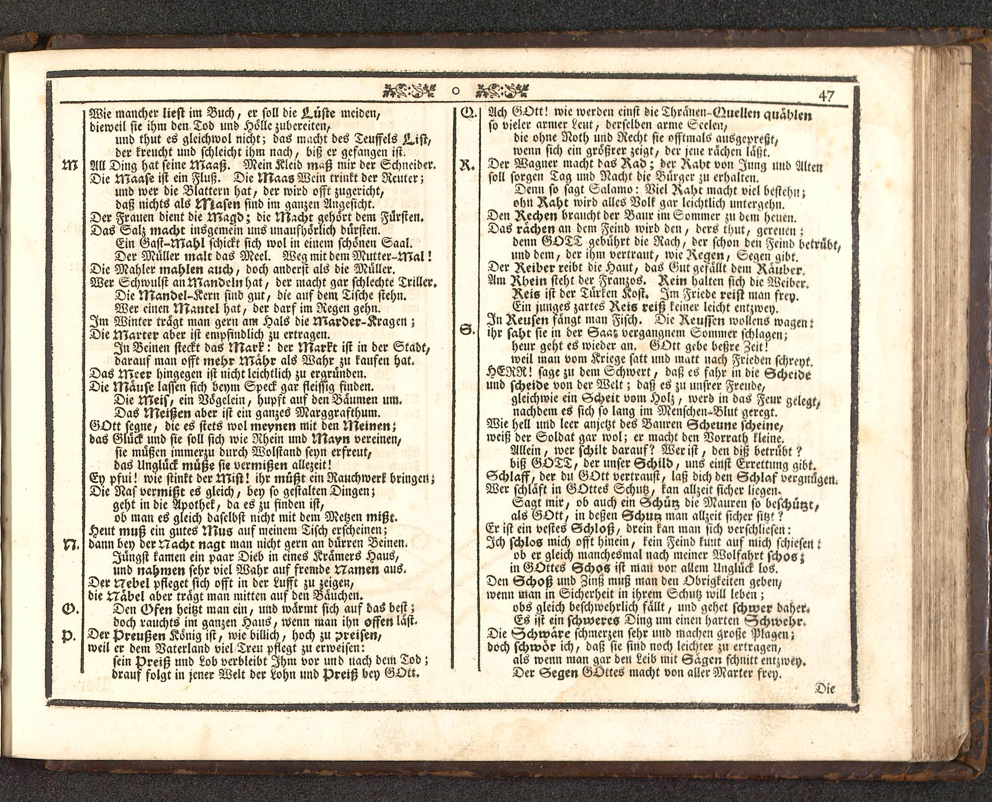 denn GOTT gebührt die Räch, der schon den Fcind betrübt,und dcm, der ihm vertraut, wie Regen, Segen gibt.Der Reider reibt die Haut, das Gut gefallt dem RäuberAm Rhein steht der Franzos. Rein halten sich die WeiberReis ist der Türken Kost. Im Friede reist man frey.Ein junges zartes Reis reiß keiner leicht entzwei).In Reusen fangt man Fifch. Die Reußen Möllens wagen:S. ihr saht sie in der Gaa! vergangnem Sommer schlagen;heur geht es wieder an. GOtt gcbc beßre Zeit!weil man vom Kriege satt lind matt nach Frieden schreytHERR! sage zu dem Schwert, daß es fahr in die Scheideund scheide von der Welt; daß es zu unsrer Freude,