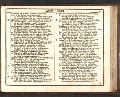 gleichwie ein Scheit vom Hol;, werd in das Feur gelegt,nachdem es sich so lang im Menschen-Blut geregt.Wie hell und leer anjctzt des Bauren Scheune scheine,weiß der Soldat gar wol; er macht den Vorrath kleine.Allein, wer schilt darauf? Wer ist, den biß betrübt ?biß GOTT , der unser Schild, uns einst Errettung gibt.Schlaff, der du GOtt vertraust, laß dich den Schlaf vergnügenWer schläft in GOttes Schutz, kan allzeit sicher liegen.