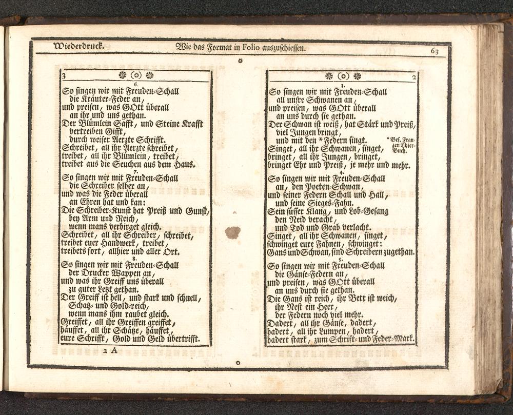 und seine Sieges-Fahn.Sein süsser Klang/ und Lob-Gesangden Neid veracht/und Tod und Grab verlacht.Singet/ all ihr Schwanen/ singet,schwinget eure Fahnen / schwinget:Gans undSchwan,sind Schreibern zugethan.
