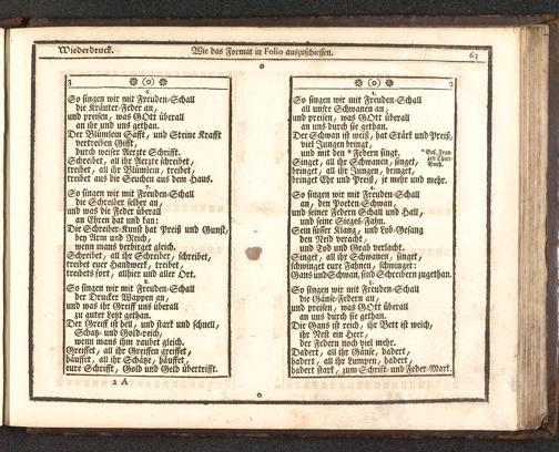 an uns durch sie gethan.Der Schwan ist weiß / hat Stark und Preiß/viel Jungen bringt,und mit den * Federn singt. ' B-/-Singet/ all ihr Schwanen/ singet/ W'"bringet/ all ihr Junge»/ bringet,bringet Ehr und Preiß/ je mehr und mehr.