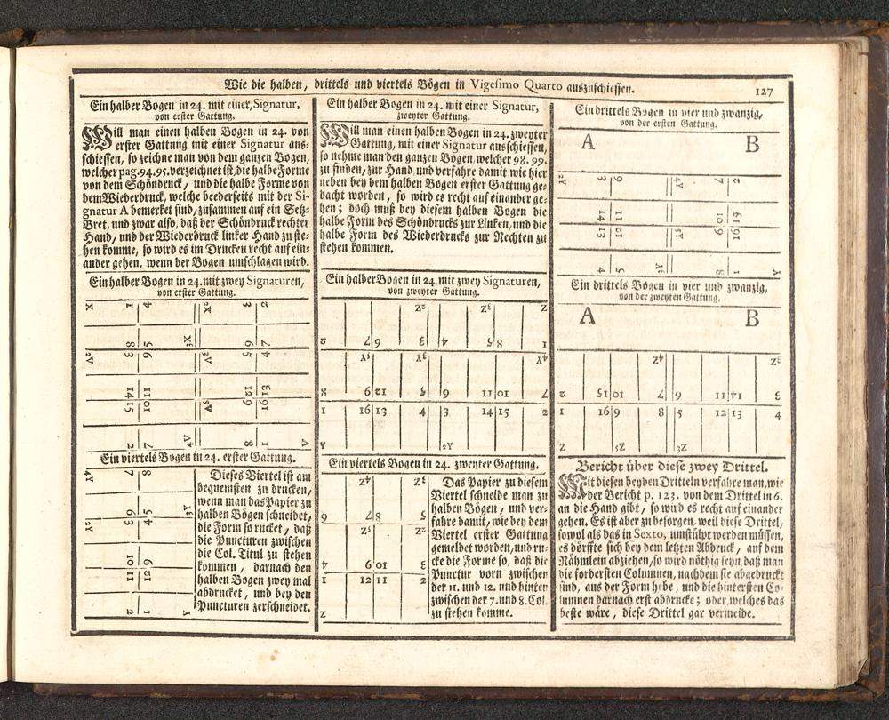 Md'U man einen halben Vogen in 24.zwe»ter Z^"^Gattung, mit einer 8iZn->rur ankschicssen,fo nehme man den ganzen Vogen welcher 98.99.zu finde»/zur Ha»d und verfahre damit wie hierneben beh dem halben Boge» erster Gattttttg ge-dacht wordett, so wird es recht anstinandcr ge-hen ; doch muß bc» diesem halbe» Bogen diehalbe Form des Schöndrucks zur Li»ke»,uud diehalbe Form des Wiederdrucks zur Rechten zustehen kommen.