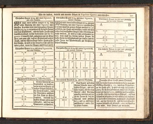 Das Papier zu diesemViertel schneide Man z»halben Bögen / und ver-fahre damit/wie bei, demViertel erster Gattunggemeldet wordenMd ru-cke die Forme so, daß dirPunctur vorn zwischerder 11. und i2. nitd hinterzwischen der ?.und 8 Col.zu stehen k.'Mme.