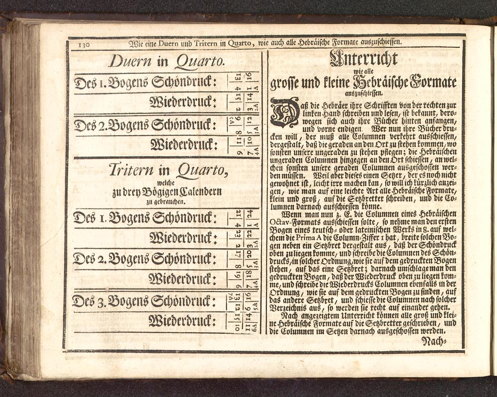 aß die Hebräer ihre Schritten Vöndertechtenzurlinken Hand schreiben nndlesen/ ist bekannt, dero-wegcn sich auch ihre Bücher hinten anfange»/" " und vorne endigen. Wer nun ihre Bücher dru-cken will, der muß alle Columnen verkehrt ausschiessen/dergestalt/ daß die geraden an den Ort zu stehen komme«/ wosonsten unsere ungeraden zu stehen pflegen; die Hebräischenungeraden Columnen hingegen an den Ort schiessen / an wel-chen sonften unsere geraden Columnen ausgeschossett wer-den müssen. We,l aber dieses einen Setzer / der es noch nichtgewohnet ist, leicht irre machen kan/ so will ick kürzlich anzei-gen/ wie man auf eine leichte Art alle Hebräische Formate/klein und groß/ auf die Setzbretter schreiben, und die Co-lumnen darnach ausschiessen könne.