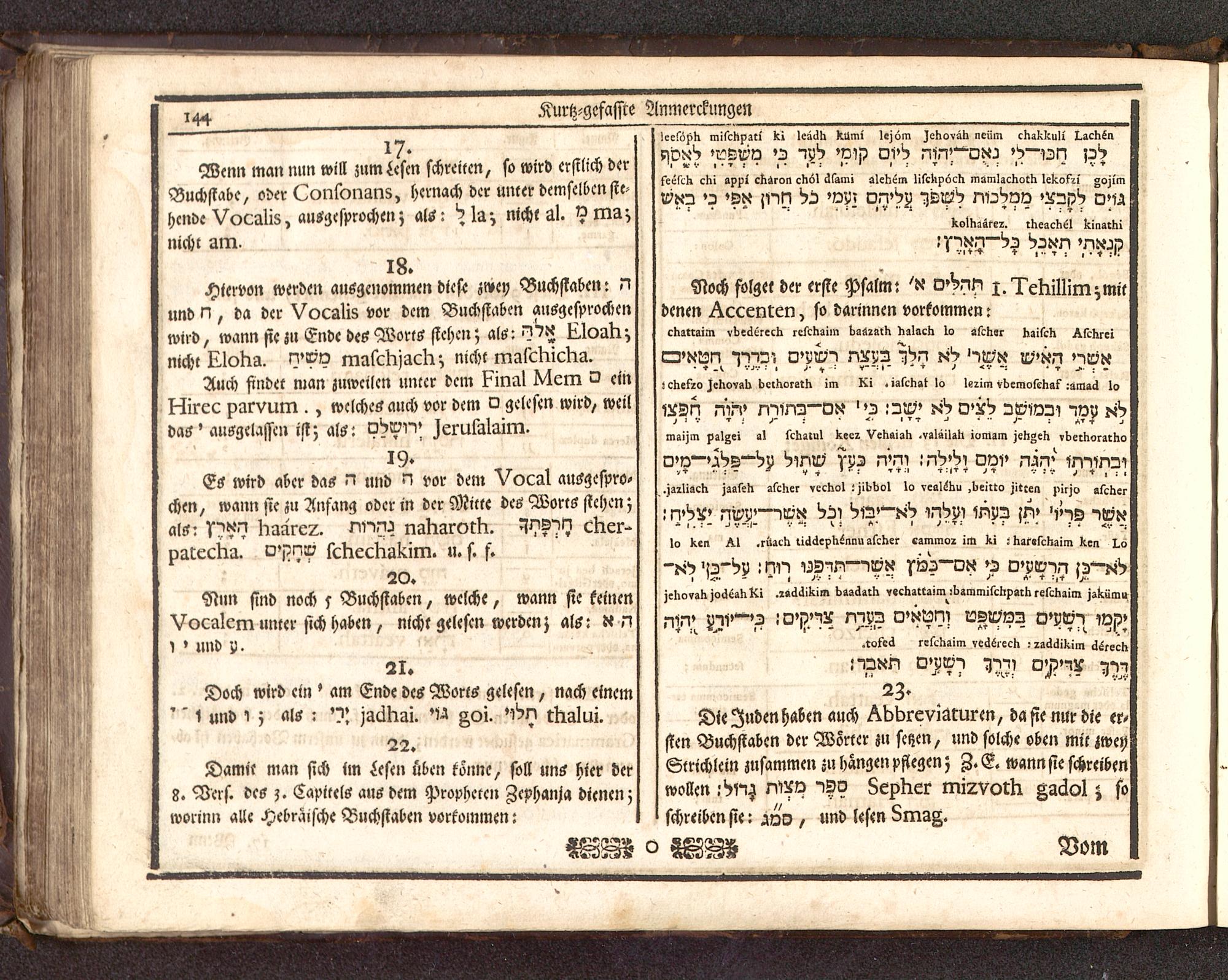 Die Juden haben auch AdbrevMuren, da sie nur die <r>sten Buchstaben der Worter zu setzen, und solche oben mit zwepStrichlein zusammen zu hangen pflegen; Z. E. wann sie schreibenwollennl^v iso 8epKer mi^votk Zaäo!; soschreiben sie: avv / und lesen 8m2Z.