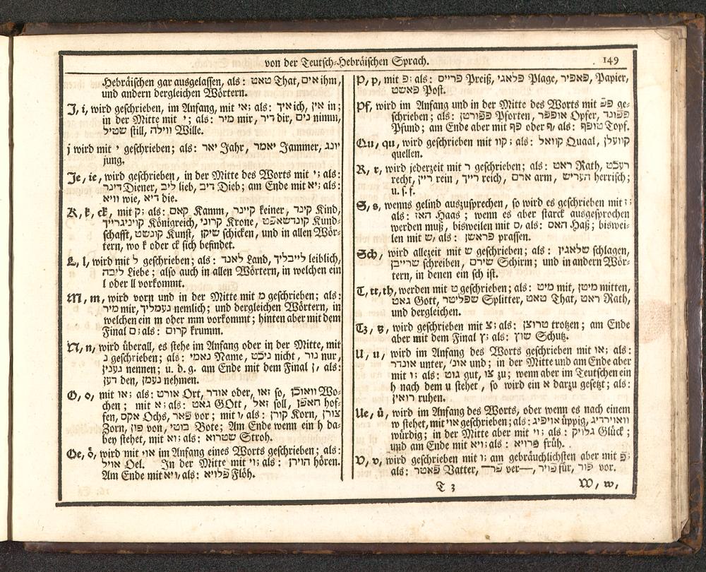 Oe, ö, wird mit »i!< im Anfang eines Worts geschrieben; als:^'ix Oel. ^in der Mitte mit n; als: Zin.i hören.Am Ende mittt'i/als: xn^SFlöh.