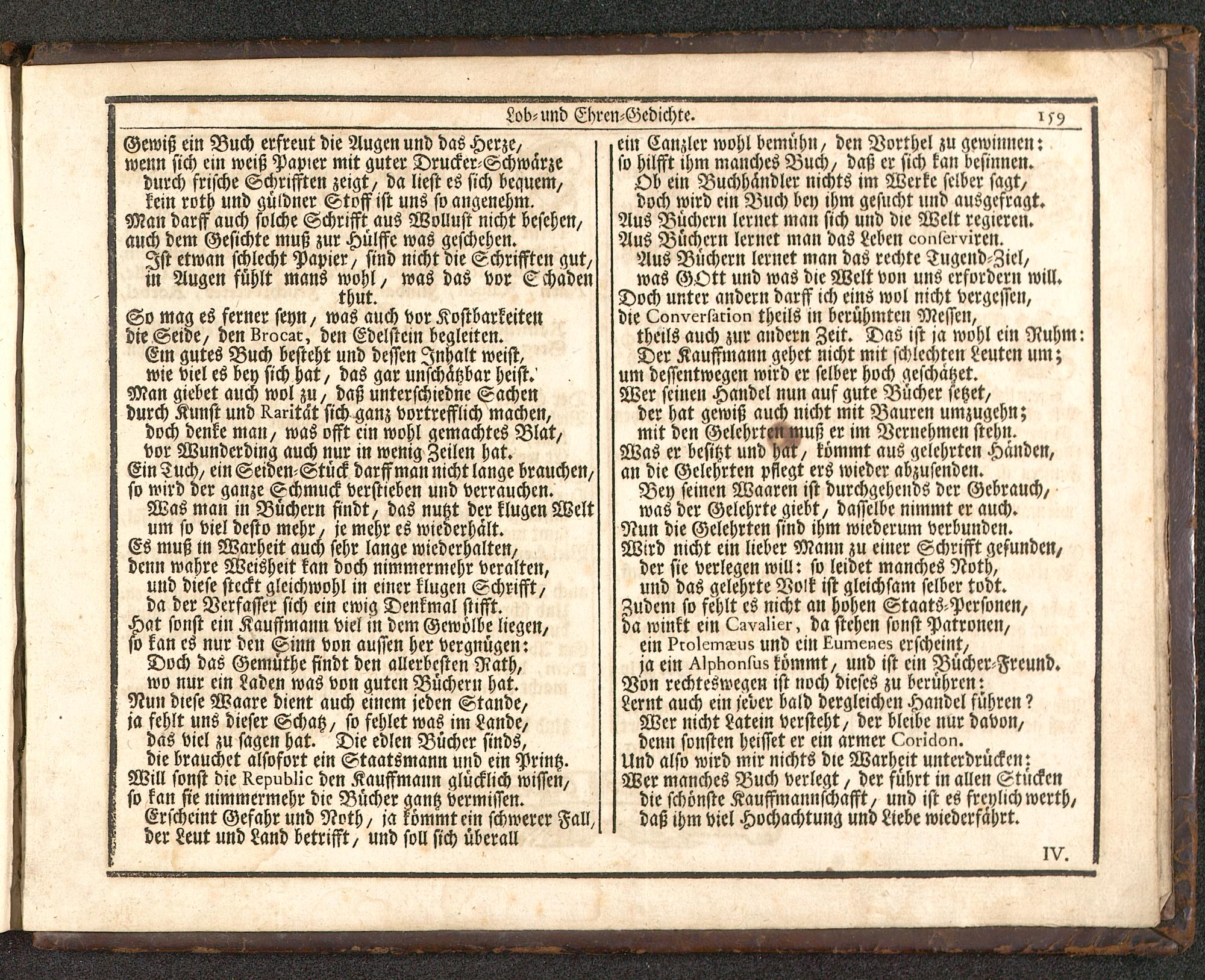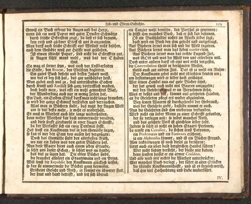 So mag es ferner seyN/ was auch vor Kostbarkeitendie Seide/ den LroLac, den Edelstein begleiten.Em gutes Buch besteht und dessen Inhalt weist,wie viel es bey sich hat / das gar unschätzbar Heist.Man giebet auch wol zu/ daß unterschiedne Sachendurch Kunst und Karitat sich ganz vortrefflich machen,doch denke man/ was osst ein wohl gemachtes Blat,vor Wunderding auch nur m wenig Zeilen hat.Ein Tuch/ ein Seiden-Stück darffman nicht lange brauchen/so wird der ganze Schmuck Vertrieben und verrauchen.Was man in Büchern findt/ das nutzt der klugen Weltum so viel desto mehr/ je mehr es wtederhält.Es muß m Warheit auch sehr lange wiederhatten/denn wahre Weisheit kan doch nimmermehr veralten,und diese steckt gleichwohl in einer klugen Schrifft/da der Verfasser sich ein ewig Denkmal stisst.Hat sonst ein Kauffmann viel in dem Gewölbe liege»/so kan es nur den Ginn von aussen her Vergnügen:Doch das Gemuthe findt den allerbesten Rath,wo nur ein Laden was von guten Büchern hat.Nun diese Waare dient auch einem jeden Stande/ja fehlt uns dieser Schatz / so fehlet was im Lande/das viel zu sagen hat. Die edlen Bücher sinds,die brauchet alsofort ein Staatsmann und ein Printz.Will sonst die KepuKUc den Kauffmann glücklich wissen/so kan sie nimmermehr die Bücker gantz vermissen.Erscheint Gefahr und Roth/ ja kömmt ein schwerer Fall,der Leut und Land betrifft/ und soll sich überall