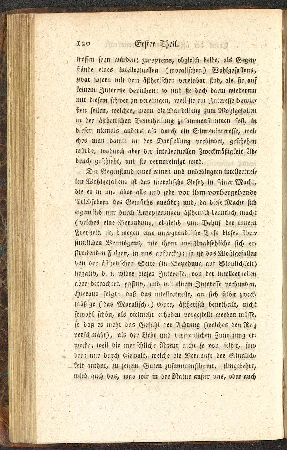 Der Gegenstand eines reinen und unbedingten intellectuel,len Wohlgefallens ist das moralische Gesetz in seiner Macht,die es in uns über alle und jede vor ihm vorhergehendeTriebfedern des Gemüths ausübt; und, da diese Macht sicheigeiiiljch nur durch Aufopferungen ästhetisch kenntlich macht(welches eine Beraubung, obgleich zum Behuf der innernFreyheit, ist, d.igcgc» eine unergründliche Tiefe dieses über,sinnlichen Vermögens, mit ihren ins Unabsehliche sich er-streckenden Folien, in uns aufdeckt): so ist das Wohlgefallenvon der ästhetischen Seite (in Vezichuug auf Sinnlichkeit)negaliv, d. i. wider dieses Interesse, von der intclleetuellenaber-betrachtet, positiv, und mir einem Interesse verbunden.Hieraus folgt: daß das intcilectuelle, an sich felbst zweck-mäßige (das Moralisch-) Gute, ästhetisch beurtheilt, nichtsowohl schon, als vielmehr erhaben vorgestellt werden müsse,so daß es mehr das Gefühl der Achtung (welches den Neizverschmäht), als der Liebe und vertraulichen Zuneigung er-wecke; weil die menschliche Natur nicht so von ftlbst, son-dern nur durch Gewalt, welche die Vernunft der Sinnlich-keit anthut, zu jenem Guten zusammenstimmt. Umgekehrt,wird auch das, was wir in der Natur außer uns, oder auch