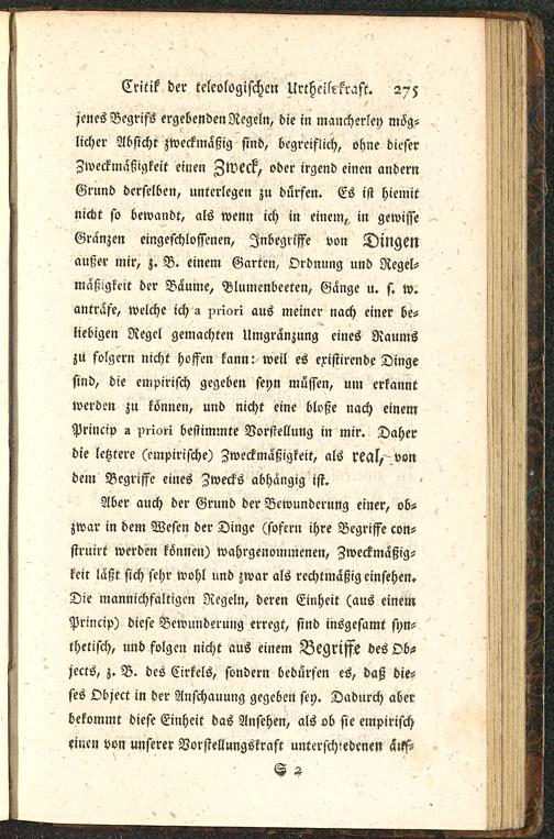 jenes Begrifs ergebenden Regeln, die in mancherley mög-licher Absicht zweckmäßig sind, begreiflich, ohne dieserZweckmäßigkeit einen Zweck, oder irgend einen andernGrnnd derselben, unterlegen zu dürfen. Es ist hiemitnicht so bewandt, als wenn ich in einem, in gewisseGränzen eingeschlossenen, Inbegriffe von DttlgMaußer mir, z. B. einem Garten, Ordnung und Regel-mäßigkeit der Bäume, Blumenbeeten, Gänge u. s. w.anträfe, welche ich a priori aus meiner nach einer be-liebigen Regel gemachten Umgränzung eines Raumszu folgern nicht hoffen kann: weil es eristirende Dingesind, die empirisch gegeben seyn müssen, um erkanntwerden zu können, und nicht eine bloße nach einemPrincip s priori bestimmte Vorstellung in mir. Daherdie letztere (empirische) Zweckmäßigkeit, als real, .vondem Begriffe eines Zwecks abhängig ist.