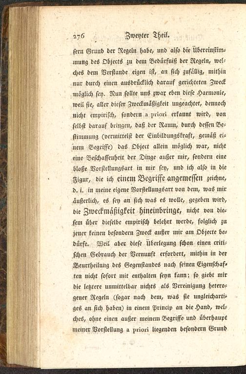 die Zweckmäßigkeit hineinbringe, nicht von die-sem über dieselbe empirisch belehrt werde, folglich zujener keinen besondern Zweck außer mir am Objecte be-dürfe. Weil aber diese Überlegung schon einen criti-schen Gebrauch der Vernunft erfordert, mithin in derBeurtheilung des Gegenstandes nach seinen Eigenschaf«ten nicht sofort mit enthalten seyn kann; so giebt mirdie letztere unmittelbar nichts als Vereinigung hetero-gener Regeln (sogar nach dem, was sie ungleichartigges an sich haben) in einem Princip an die Hand, wel-ches, ohne einen außer meinem Begriffe und überhauptmeiner Vorstellung a xrlori liegenden besondern Grund
