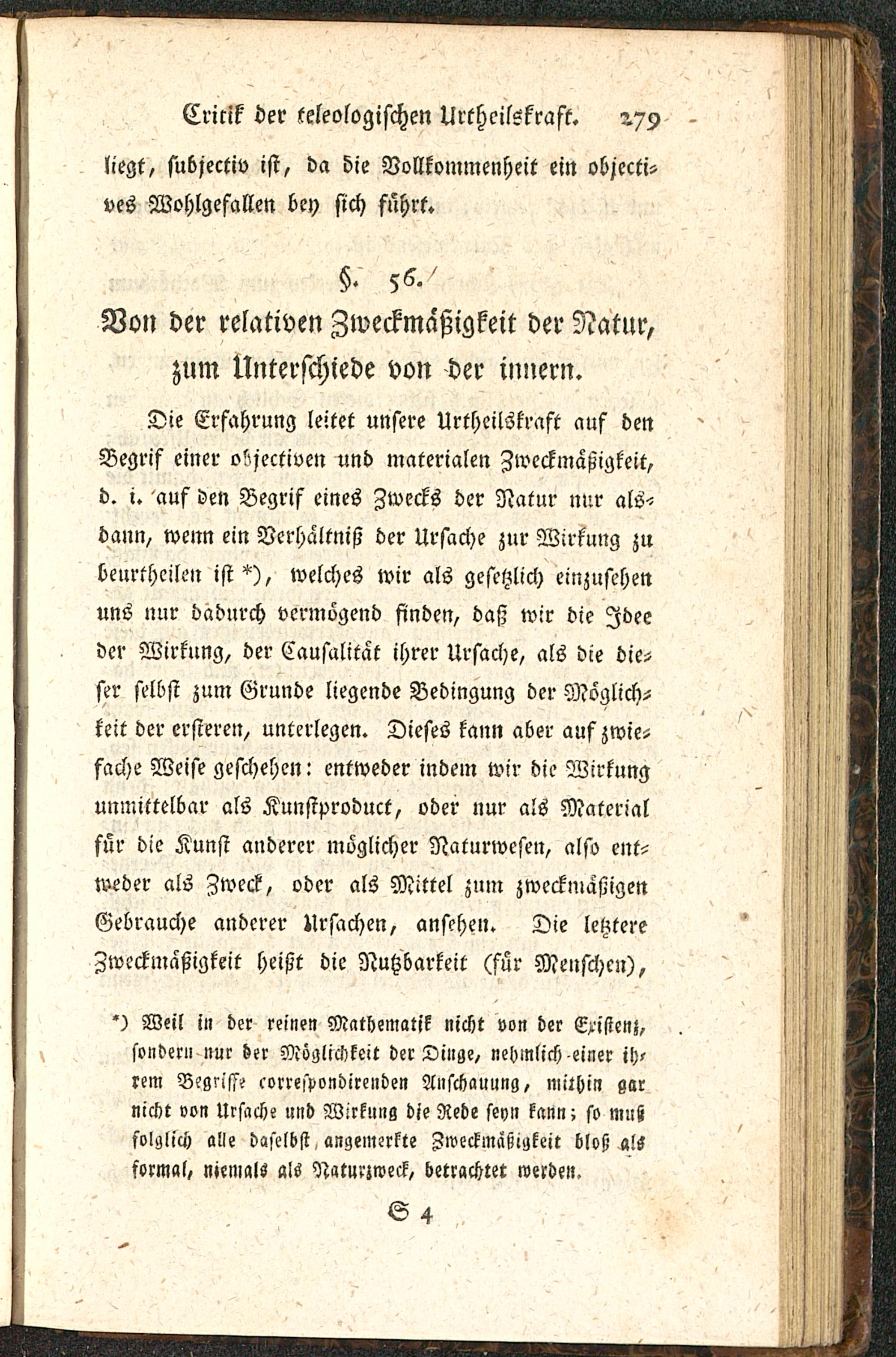 ') Weil in der reinen Mathematik nicht von der Existenz,sondern nur der Möglichkeit der Dinge, nehmlich einer il>rem Begrif correspvndirenden Anschauung, mithin garnicht von Ursache und Wirkung die Rede seyn kann; so mußfolglich alle daselbst angemerkte Zweckmäßigkeit bloß alsformal, niemals als Naturzweck, betrachtet werden.