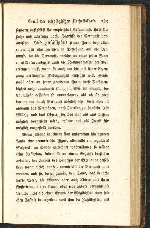 Wenn jemand in einem ihm unbewohnt scheinendenLande eine geometrische Figur, allenfalls ein reguläresSechseck, im Sande gezeichnet Wahrnahme; so wurdeseine Reflexion, indem sie an einem Begriffe derselbenarbeitet, der Einheit des Princips der Erzeugung dessel-ben, wenn gleich dunkel, vermittelst der Vernunft innewerden, und so, dieser gemäß, den Sand, das benach-barte Meer, die Winde, oder auch Thiere mit ihrenFußtritten, die er kennt, oder jede andere vernunftloseUrsache nicht als einen Grund der Möglichkeit einer sol,chen Gestalt beurtheilen: weil ihm die Zufälligkeit, mit
