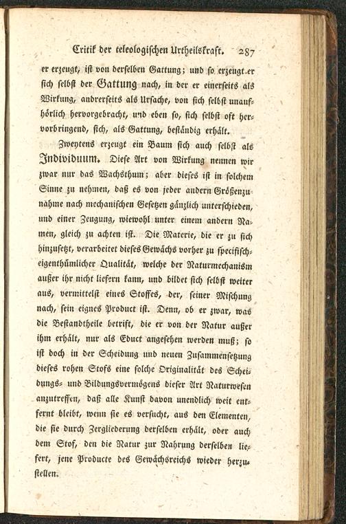 Zweytens erzeugt ein Baum sich auch selbst alsIndividuum. Diese Art von Wirkung nennen wirzwar nur das Wachsthum; aber dieses ist in solchemSinne zu nehmen, daß es von jeder andern Größenzu^nähme nach mechanischen Gesetzen gänzlich unterschieden,und einer Zeugung, wiewohl unter einem andern Na>men, gleich zu achten ist. Die Materie, die er zu sichhinzusetzt, verarbeitet dieses Gewächs vorher zu specifisch-eigenthümlicher Qualität, welche der Naturmechanismaußer ihr nicht liefern kann, und bildet sich selbst weiteraus, vermittelst eines Stoffes, der, seiner Mischungnach, sein eignes Product ist. Denn, ob er zwar, wasdie Bestandtheile betrift, die er von der Natur außerihm erhält, nur als Educt angesehen werden muß; soist doch in der Scheidung uud neuen Zusammensetzungdieses rohen Stoss eine solche Originalität des Schei-dungs- und Bildungsvermvgens dieser Art Naturwesenanzutreffen, daß alle Kunst davon unendlich weit ent-fernt bleibt, wenn sie es versucht, aus den Elementen,die sie durch Zergliederung derselben erhält, oder auchdem Stof, den die Natur zur Nahrung derselben lie^fert, jene Producte des Eewächsreichs wieder herzu,stellen.