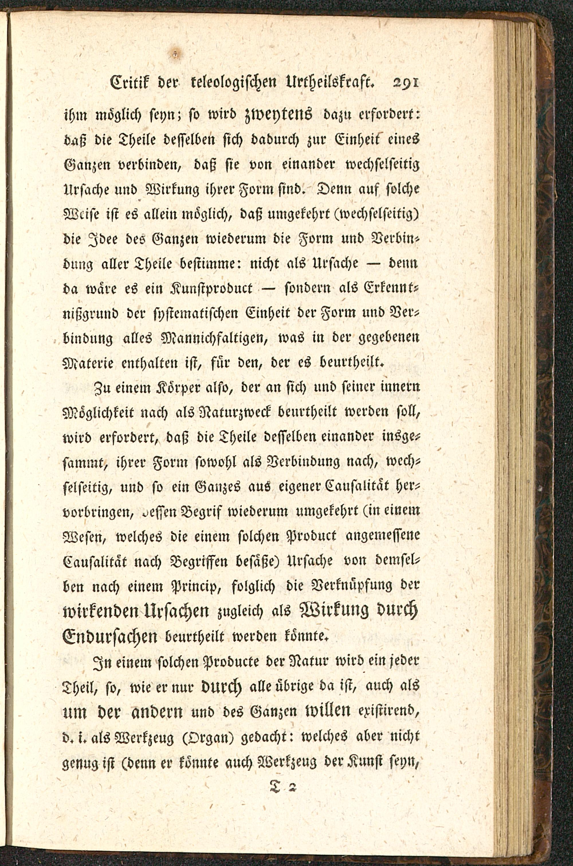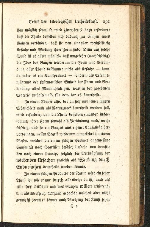 In einem solchen Producte der Natur wird ein jederTheil, so, wie er nur durch alle übrige da ist, auch alsUM der andern und des Ganzen willen eMirend,d. i. als Werkzeug (Organ) gedacht: welches aber nichtgenug ist (denn er könnte auch Werkzeug der Kunst seyn,