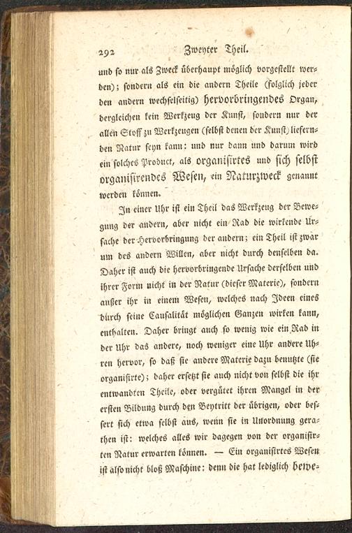 In einer Uhr ist ein Theil das Werkzeug der Bewe-gung der andern, aber nicht ein Rad die wirkende Ur-sache der Hervorbringung verändern; ein Theil ist zwarum des andern Willen, aber nicht durch denselben da.Daher ist auch die hervorbringende Ursache derselben undihrer Form nicht in der Natur (dieser Materie), sondernaußer ihr in einem Wesen, welches nach Ideen einesdurch seine Causalitat möglichen Ganzen wirken kann,enthalten. Daher bringt anch so wenig wie ein Rad inder Uhr das andere, noch weniger eine Uhr andere Uh-ren hervor, so daß sie andere Materie dazu benutzte (sieorganisirte); daher ersetzt sie auch nicht von selbst die ihrentwandten Theile, oder vergütet ihren Mangel in derersten Bildung durch den Beytritt der übrigen, oder bes-sert sich etwa selbst aus, wenn sie in Unordnung gera.-then ist: welches alles wir dagegen von der organisir-ten Natur erwarten können. — Ein organisirtes Wesenistalsonicht bloß Maschine: denn die hat lediglich hetve-