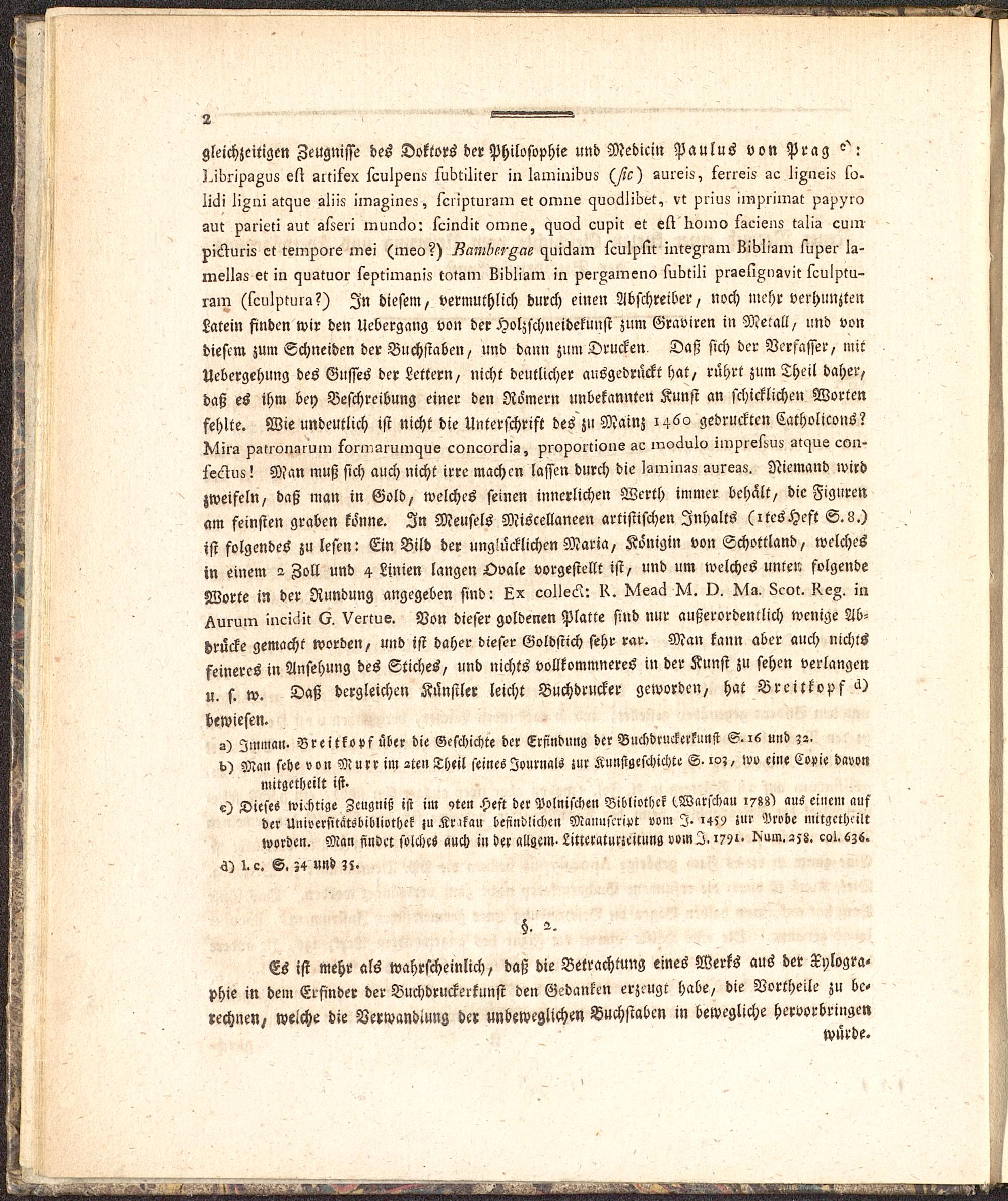 mellss et in czuatuor seotimznis tntam LiKIism in veiAgmeno iubtili vraeliA>,gvit sculotu-izm (tculvtuia?) In diesem, vermuthlich durch einen Abschreiber, noch mehr verhunztenLatein finden wir den Uebergang von der Holzschneidekunst zum Graviren in Metall, und vondiesem zum Schneiden der Buchstaben, und dann zum Drucken, Daß sich der Verfasser, mitUebergehung des Gusses der Lettern, nicht deutlicher ausgedrückt hat, rührt zum Theil daher,daß es ihm bey Beschreibung einer den Römern unbekannten Kunst an schicklichen Wortenfehlte. Wie undeutlich ist nicht die Unterschrift des zu Mainz 1460 gedruckten Catholicons?Ivlirs vatron-uuin t"orn,arulncjue concor^is, provortions ac inoäulo ilnvrei^ux gtc^us con-fectu8! Man muß sich auch nicht irre machen lassen durch die lsmin-,5 suregx. Niemand wirdjweifeln, daß man in Gold, welches seinen innerlichen Werth immer behalt, die Figurenam feinsten graben könne. In Meusels Miscellaneen artistischen Inhalts (itesHeft S.L.)ist folgendes zu lesen: Ein Bild der unglücklichen Maria, Königin von Schottland , welchesin einem 2 Zoll und 4 Linien langen Ovale vorgestellt ist, und um welches unten folgendeWorte in der Rundung angegeben sind: colleÄ: K. K4ea6 O. I^g. z^ot. KeZ. inHurmn inci^it <?. Vertue. Von dieser goldenen Platte sind nur außerordentlich wenige Ab-drücke gemacht worden, und ist daher dieser Eoldstich sehr rar. Man kann aber auch nichtsfeineres in Ansehung des Stiches, und nichts vollkommneres in der Kunst zu sehen verlangenu. s. w. Daß dergleichen Künstler leicht Buchdrucker geworden, hat Breitkopf ^)bewiesen.