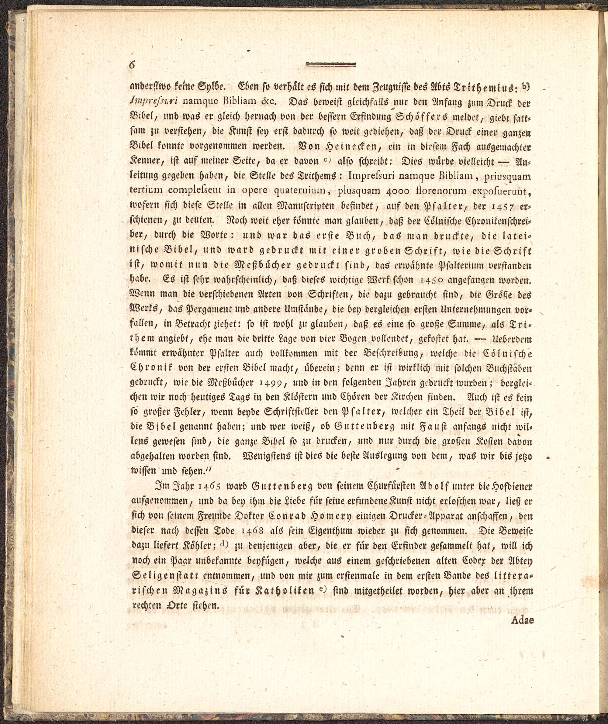 Im Jahr 1465 ward Guttenberg von seinem Churfürsten Adolf unter dieHofdieneraufgenommen, und da bey ihm die Liebe für seine erfundene Kunst nicht erlofchen war, ließ ersich von seinem Freunde Doktor Conrad Homer» einigen Drucker-Apparat anschaffen, dendieser nach dessen Tode 1468 als sein Eigenthum wieder zu sich genommen. Die Beweisedazu liefert Köhler; ^ zu denjenigen aber, die er für den Erfinder gesammelt hat, will ichnoch ein Paar unbekannte beyfügen, welche aus einem geschriebenen alten Coder der AbteySeligenstatr entnommen, und von mir zum erstenmale in dem ersten Bande des littera-rischen Magazins für Katholiken ^) sind mitgetheilet worden, hier aber an ihremrechten Orte stehen.