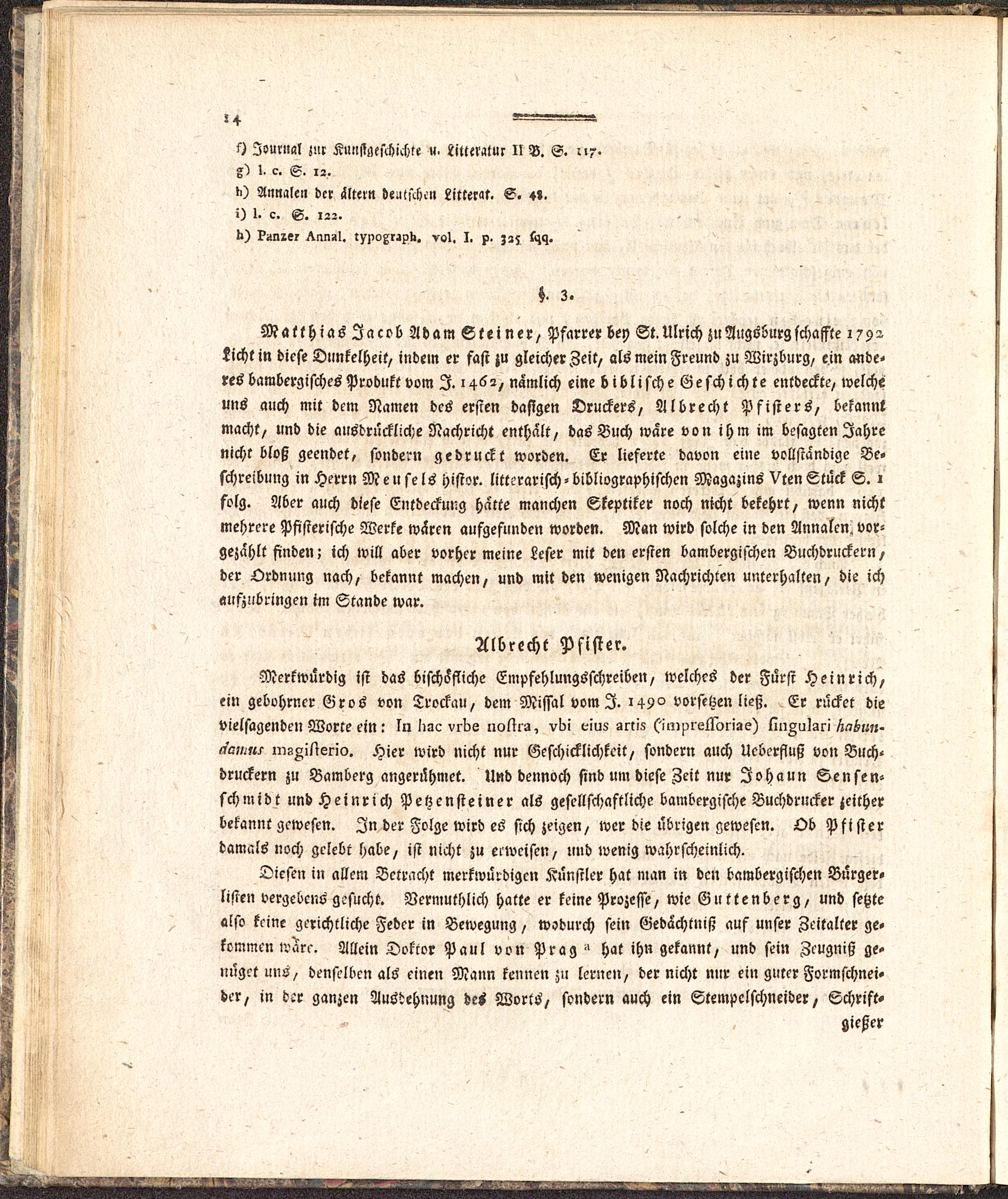 Matthias Jacob Adam Steiner, Pfarrer bey St> Ulrich zu Augsburg schaffte 1792kichtin diese Dunkelheit, indein er fast ju gleicher Zeit, als mein Freund zu Wirzburg, ein ande-res bambergisches Produkt vom 1.1462, nämlich eine biblische Geschichte entdeckte, welcheuns auch mit dem Namen des ersten dasigen Druckers, Albrecht Pfisiers, bekanntmacht, und die ausdrückliche Nachricht enthalt, das Buch Ware von ihm im besagten Jahrenicht bloß geendet, sondern gedruckt worden. Er lieferte davon eine vollständige Be-schreibung in Herrn Meusels histor. litterarisch-bibliographischen Magazins VtenStuck S. 1folg. Aber auch diese Entdeckung hatte manchen Skeptiker noch nicht bekehrt, wenn nichtmehrere Pfisterifche Werke wären aufgefunden worden. Man wird solche in den Annalen, vor-gezählt finden; ich will aber vorher meine Leser mit den ersten bambergischen Buchdruckern,der Ordnung nach, bekannt machen, und mit den wenigen Nachrichten unterhalten, die ichaufzubringen im Stande war.