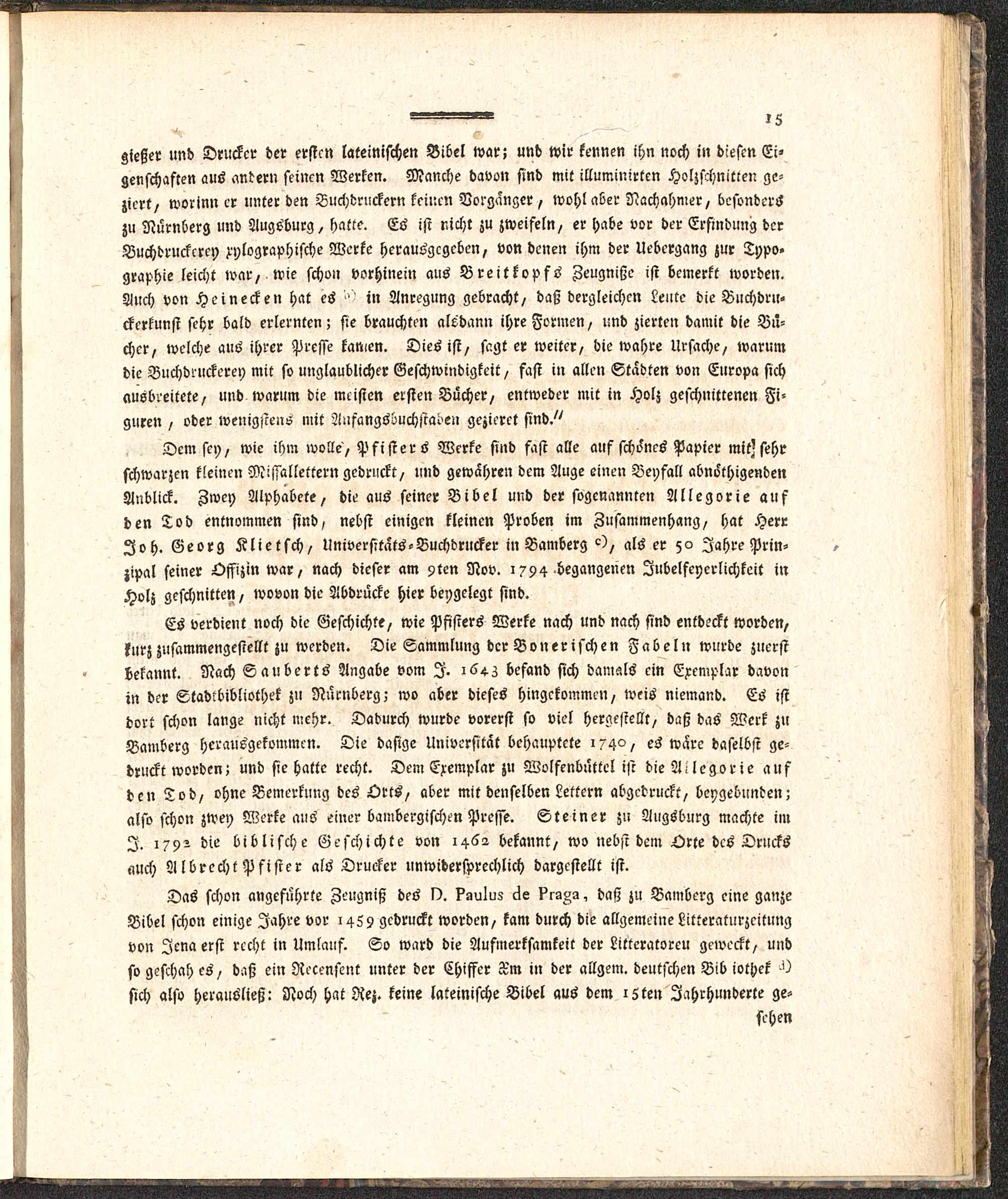 Dem sey, wie ihm wolle, Pfisters Werke sind fast alle auf schönes Papier mit'sehrschwarzen kleinen Missallettern gedruckt, und gewahren dem Auge einen Beyfall abnöthigendenAnblick. Zwey Alphabete, die aus seiner Bibel und der sogenannten Allegorie aufden Tod entnommen sind, nebst einigen kleinen Proben im Zusammenhang, hat HerrJoh. Georg Klietsch, Universitäts-Buchdrucker in Bamberg c), als er 50 Jahre Prin-zipal seiner Offizin war, nach dieser am 9ten Nov. 1794 begangenen Jubelfeyerlichkeit inHolz geschnitten, wovon die Abdrücke hier beygelegt sind.