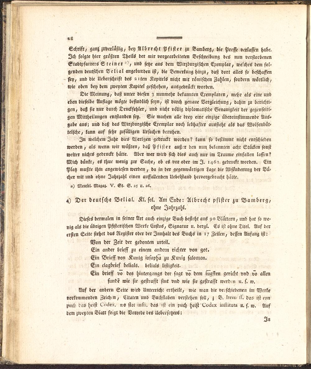 In welchem Jahr dies Werigen gedruckt worden? kann so bestimmt nicht entschiedenwerden, als wenn wir wüßten, daß Pfister auß.r den nun bekannten acht Stücken sonstweiter nichts gedruckt hatte. Aber wer wird sich dies auch nur im Traume einfallen lassen?Mich dünkt, es thue wenig zur Sache, ob es vor oder im I. 1462 gedruckt worden. EinPlatz mußte ihm angewiesen werden , da in der gegenwartigen Lage die Absönderung der Bü-cher mit und ohne Jahrzahl einen auffallenden Uebelstand hervorgebracht hatte,s) Meuftl- M-igaz. V. St- S. 25 u. 26.