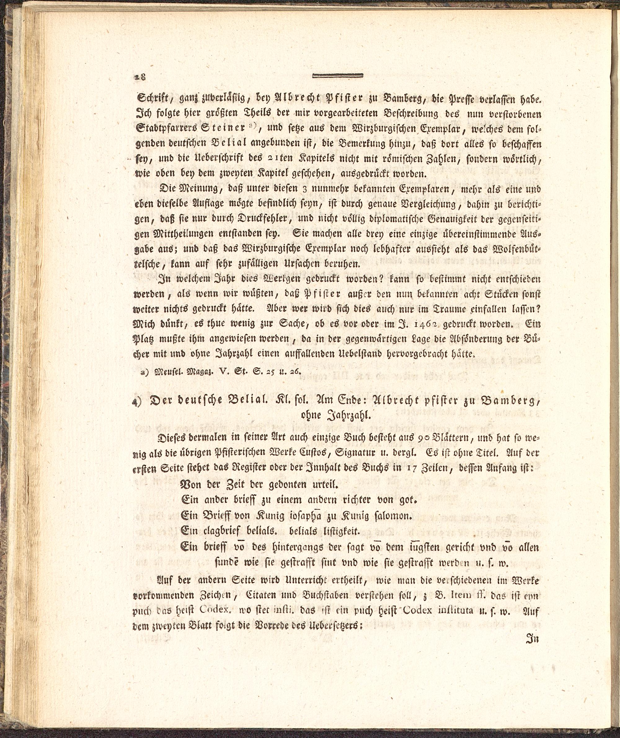 Schrift, ganz zuverlässig, bey Albrecht Pfister zu Bamberg , die Presse verlassen habe.Ich folgte hier größten Theils der mir vorgearbeiteten Beschreibung des nun verstorbenenStadtpfarrers Steiner ^, und setze aus dem Wirzburgischen Exemplar, welches dem fol-genden deutschen Vclial angebunden ist, die Bemerkung hinzu, daß dort alles so beschaffensey, und die Ueberschrift des 2iten Kapitels nicht mit römischen Zahlen, sondern wörtlich,Wie oben bey dem zweyten Kapitel geschehen, ausgedrückt worden.