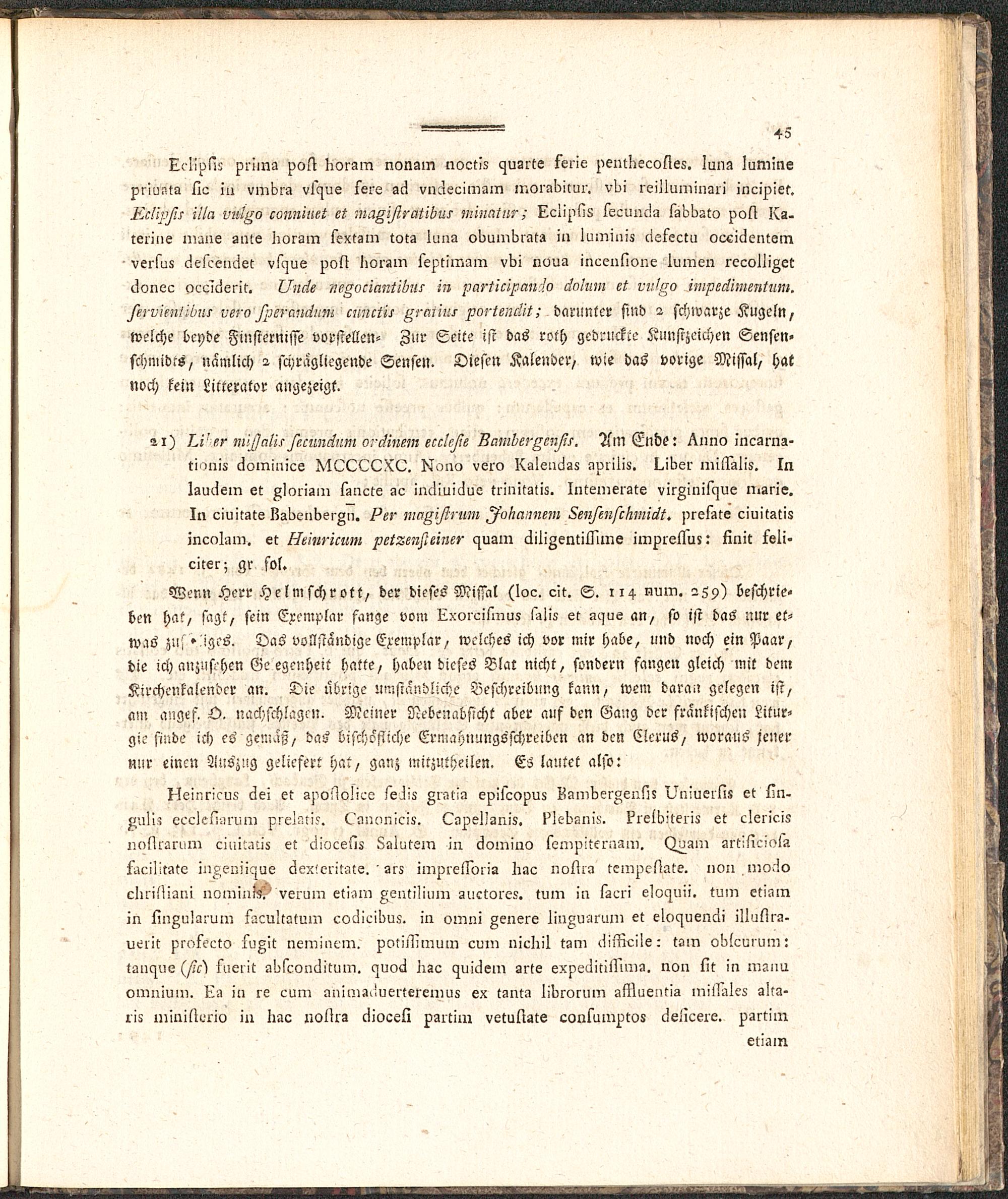 Wenn Herr Helmschrott, der dieses Missal (loe. cit. S. 114 num. beschrie-ben hat, sagt, sein Exemplar fange vom llxorcilinuz isli'5 et sczue an, so ist das nur et-w>is zus» iges. Das vollständige Eremplar, welches ich vor mir habe, und noch ein Paar,die ich anzusehen Ge egeuheit hatte, haben dieses Blat nicht, sondern fangen gleich mit demKirchenkalender an. Die übrige umständliche Beschreibung kann, wem daran gelegen ist,am angef, O. nachschlagen. Meiner Nebenabsicht aber auf den Gang der fränkischen Litur-gie finde ich es gemäß, das bischofliche Ermahnungsschreibcn an den Clerus, woraus jenernur einen Auszug geliefert hat, ganz mitzutheilen. EZ lautet also: