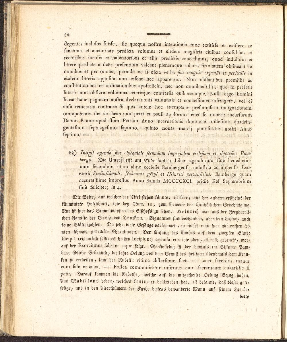 Die Seite, auf welcher der Titel stehen könnte, ist leer; auf der andern erscheint derklluminirte Holzschnitt, wie bey Num. 12, zum Beweise der Bischöflichen Eer-ehmlgung.Nur ist hier das Stammwappen des Bischofs zu sehen. Heinrich war aus der Freyherrli-chen Familie der Groß von Trockau. Signaturen sind vorhanden, aber kein Custos, auchkeine Blatterzahlen. Da sehr viele Gesänge vorkommen, so findet man hier auf rothen Li-nien schwarz gedruckte Choralnoten. Der Anfang des Buches auf dem zweyten Blatt:lucioit (eigentlich sollte es heißen Iucij)iunt) g?cuc!a etc. wie oben, ist roth gedruckt, wor-auf der Lx«rLiunuü lÄi,>> et .iczue folgt. Merkwürdig ist der damals im Bistume Bam-berg übliche Gebrauch, die letzte Delung vor dem Genuß des heiligen Abendmals dem Kran-ken zu ertheilen, laut der Rubrik: vltiina arilierlione facta — jguet i!,Le.ä<i8 inunuzcuin tale et «einü. — koiiea coininunicetur inlinnuz cuin lciciiimento eu!<!uis!ie tl^etit. Darauf kommen die G/bethe, welche auf die mitgetheilte Oelung Bezug haben.Aus Mabillons Leben, welches Ruinart beschrieben hac, m bekannt, daß dieser g tt-selige, und in den Alterthümern der Kirche lxsie.,6 bewanderte Mann auf seinem Sterbe-bette