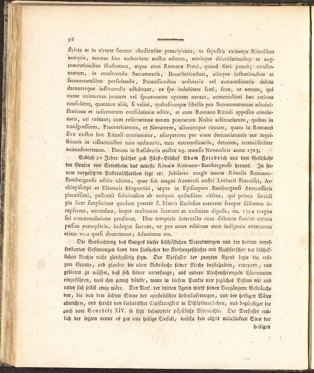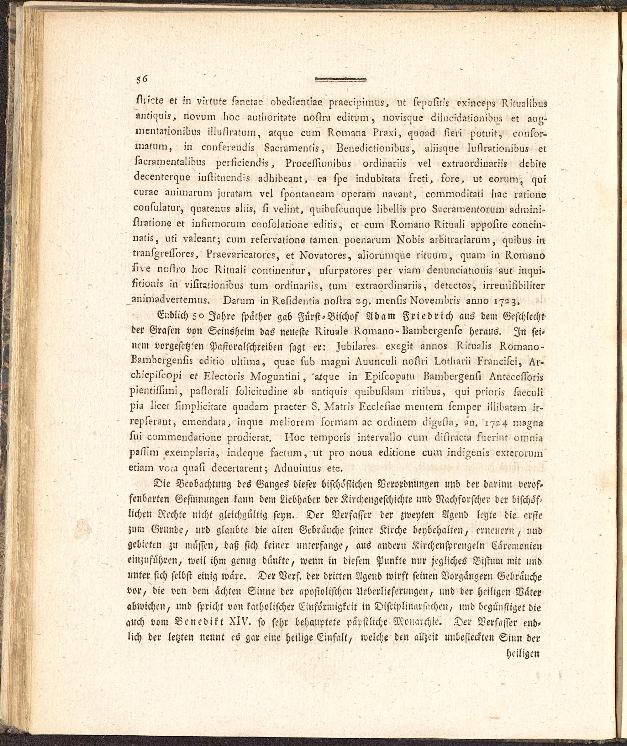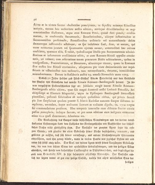 Endlich 5 o Jahre fpather gab Fürst-Bischof Adam Friedrich aus dem Geschlecht-der Grafen von Seinsheim das neueste lvitusle Komsno - LsmdciAenie heraus. In sei-nem vorgesetzten Pastoralschreibcn sagt er: .^udilsres exc^it annoz Kituciliz Kom-ino-I^smlier^enliz ecZitio ulllmz, c^use 5ub ms^ni /vuunculi nollr! l..ntI,Arii ^rüncile!, ^r-ck^iepis^opi et Tlsctcuiz ^loZuntini, 's^czue in HpilcopgM ZzmIzerZenli ^nteceiTorispientiilu^i, plllioraü lolieitucline i>l> k,r.ti^ui5 ciniku^iüm rilil?n5, ciui prinris süecullpia licet limplicilJte ciuüciom pr?.eter 8. ^-lütriz Lecleüüe mentern sernper illidglüm ir-repserant, cn'.enelalg^ inczue meliorem fonns.m ac orelineni (l!A-!llg, c>n. 1724 n^AnaIri! cc,nnr>en6at!one proclicrat. I-Ioc teinporis intervsllo eum ^illr^etg 5nerinf omniapsllnn exeinplsri«, in>.!e^ue fgetum, ut pro noua eclitions cu:n inci-Aenis exterorumetiain voc-> c^ugil cleceiwrent; ^einuimus etc:.