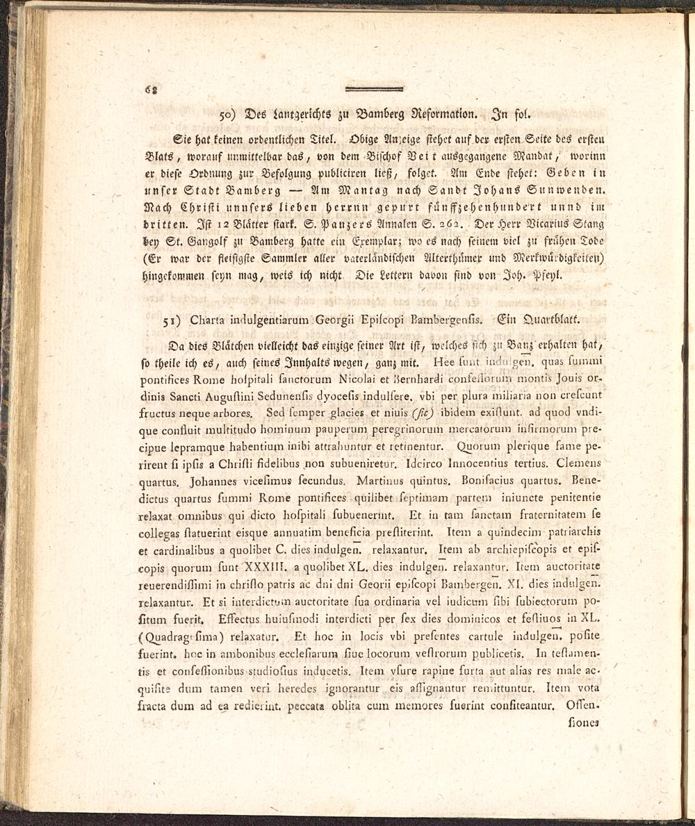 Sie hat keinen ordentlichen Titel. Obige Anzeige stehet auf der ersten Seite deS erstenBlats, worauf unmittelbar das, von dem Bischof Vei t ausgegangene Mandat, worinncr diefe Ordnung zur Befolgung publiciren ließ, folget. Am Ende stehet: Geben inlinfcr Stadt Bamberg — Am Man tag nach Sandt Johans Sun wenden.Nach Christi unnfers lieben herrnn gepurr fünffzehenhundert unnd iiudritten. Ist i2 Blatter stark. S. Panzers Annalen S. 262. Der Herr Vicarius Stangbey St. Gangolf zu Bamberg hatte ein Exemplar; wo es nach feinem viel zu frühen Tode(Er war der fieisigsie Sammler aller vaterländischen Alterthümer und Merlwü'digkeilen)hingekommen seyn mag, weis ich nicht Die Lettern davon sind von Ich. Pseyl.