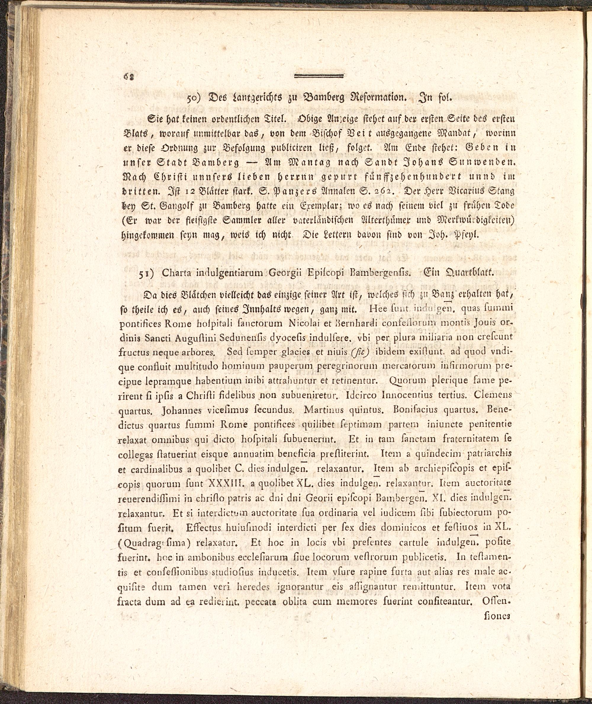 Da dies Blatchen vielleicht das einzige feiner Art ist, welches s-'h zu Banz erhalten hat,so theile ich es, auch seines Innhalts wegen, ganz mit. I-Iee ün.r il:-,4-,!Aen. czus:> sun.nnpont!lice5 Koine iiolpikali fiiiictoluin !^ic»!gi et!jern!igre!i conie!i>'i lii'.i >nonki>> ^ouiz or.6iniz Lgncn ^uAuslini Lec!unens!!> cl/oeeliz inciul5sie. vb! j?er plui» nnlisna non erel^untjiuctus neczue!nl'ore5. 3eci lcmpsr «lIcie! et niu!i> ^/?/^) iKI^ein exil^unt. acj cjuod vn^i-<^ue conttnit multituclo ^nininuin nsupeium pere^rinoruin ineic-ziviuin inliimai un, pse-cijzue leprainque Iii>I)entiu^ iniizi sltisliuntur et letinentur. Ouniuin pleric^ue f-ime pe.lirent II i^liz g LInilii Iic!el!vu5 non subueniretu!'. I^cirev Innocennuz tertius. (kleinen«c^uartus. lolisnnes vicelunu! lec-undus, ^Isitinu« <^uintU8. ljoiiisüciuz c^uüituz. Kene -<^!Ltuö> c^ugituz lumm! Ivvme vonliliees c^uilioet leptimüin parteiu iniuncts penitenriere?axst omnious czui äicto liotjzitali 5uizuenerint. Lt in mm Innc-tüM srcitelnitAtem 5ecolls^g5 sigtueriut eizaue sunuatiin lzen^llcig piesiiteiint. Item s czuincleciln j^ti igrclzizet c!>i'(jingl!^U8 g c^nolilzet L. <.ii^8 inclnlAen. relaxsntur. Itein s!> areliie^iscopiz et epi5-copis czuniuin tunt XXXIII. 2 c^uolioct XL.. c^ie8 inciulAen. relZXgntur. Itoin LULtoiitgcezeuerencWuni in einilln ^^riiz .^>c c!n! ^n! (Zeorii episcvpi lZglnbe^cn. XI. cllez in^ulAcn.relsxanwr. üt 5! inleicüct^in guctoritZte 5uz arclinsria vel iu^icu-n s!!zi fulzieetoinm po»Atum fuerit. Ll?ectus Iiuiusinucli inteiclicti per lex cüez (.Ivmiiiicoz et 5elliuo8 in XL.^ ()ug^rgA'lim-i) re^x-itur. Tt lioc: in loeiz vl)i jzrelcntes c-ntule iuelul^en. Police^usrint. I^o in 7>n^!z<)nil?ii8 ecclelluiuin üue loeorum vellioiuin pul'!iV.-et>8. In tel?.ui,kn.tis et cc)»felli(>ni!^u3 8luc!ioliu8 in^ucetix. It?ni v5u>e rc-pins snil-i !^ut alias res ni^ie iic-c>uis!t? c?um t-^men veri liereclez i^noriintur eis slli^nsnNir reniittuntui^ Itcin vntasrscts cium 26 re^ieiiut. peccsta ovu'ta cuin inciuv^eö susrint conlltesiuur. Ollen.