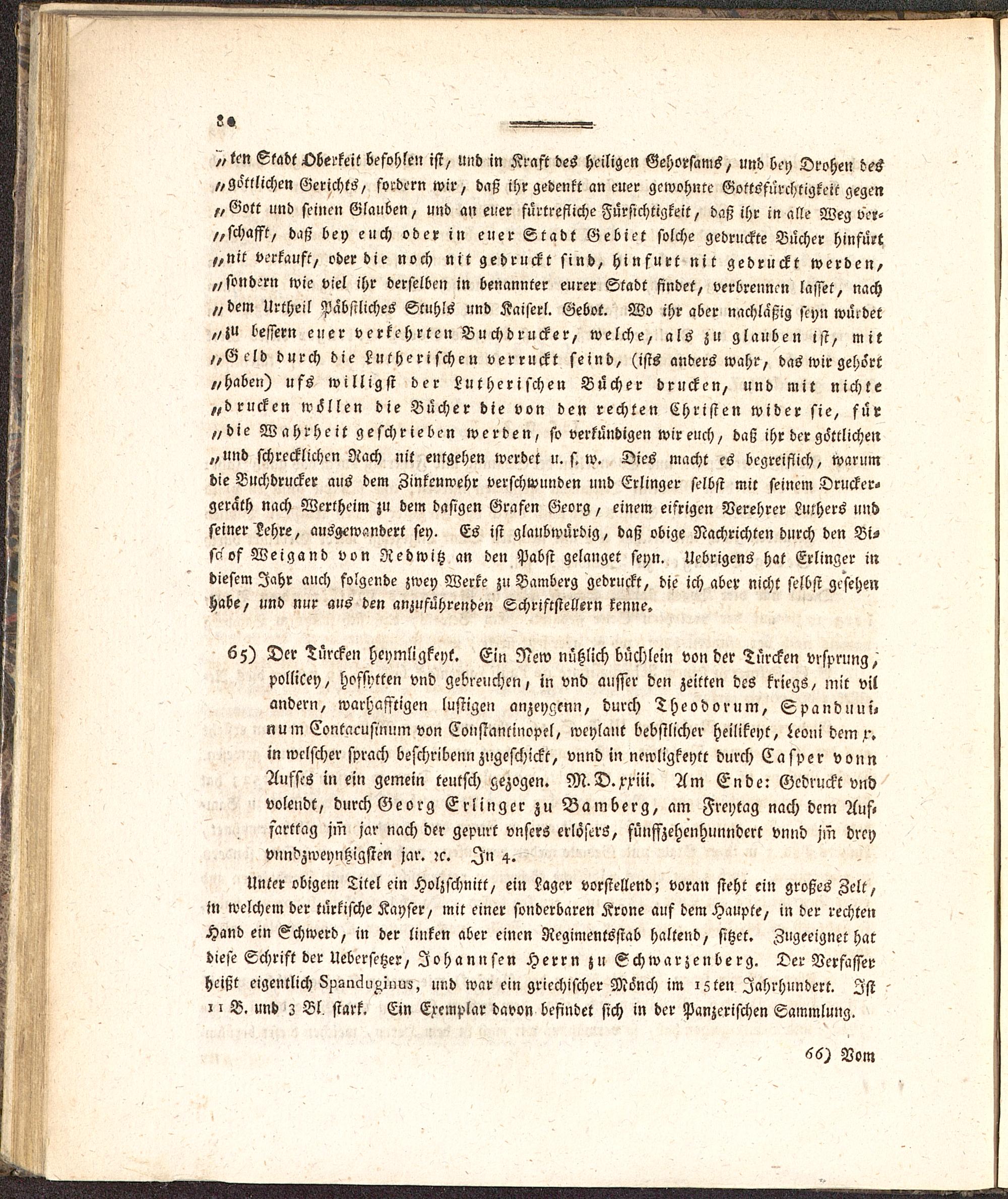 65) Der Türcken heymligkeyt. Ein New nützlich Küchlein von der Türcken vrsprung,pollicey, hofiytten vnd gebreuchen, in vnd ausser den zeitten des kriegs, mit vilandern, warhafftigen lustigen anzeygcnn, durch Theodorum, Spanduui«num Contacusinum von Coustantinopel, weylcmt bebstlichcr heilikeyt, ieoui dem ^.in welscher sprach beschribenn zugeschickt, vnnd in ncwligkeytt durch Casper vonnAufscs in ein gemein teutsch gezogen. MD.xxiii. Am Ende: Gedruckt vndvolendt, durch Georg Erlinger zu Vamberg, am Freytag nach dem Auf-farttag jin jar nach der gepurt vnserS erlösers, fünffzehenhunndert vnnd jm dreyvundzweynhigsten jar. ze. In 4.