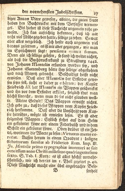 biger Anton Vitre gewesen, alleine, die guien Leutehaben den Buchdrucker mit dem Verfasser vermen-get. Bis Hieher ist diese Nachricht ungemein rahr ge-wesen. Ich kan aufrichtig bekennen, daß ich mirrecht viel Mühe gegeben hatte, selbige zu sehen Es waraber alles vergeblich. Ich hoste auch ungemein vieldaraus zulernen, es ist mir aber gegangen, wie manim Sprüchwort sagt: prsetLnris ,-nnu r f?msm .Denn als ich selbige gelesen, so fand ich weiter nichts,als daß die Buchdruckerkunst zu Straßburg 1442.von Johann Mentelin erfunden worden sey, undJohann Guerenberg hatte ihm selbige abgestohlenund nach Mayntz gebracht. Beschuldigt heißt nichterwiesen. Daß aber lNenteUn der Erfinder gewe-sen seyn soll, sucht er daher zu n harten: der KayserFriedrich hat Mcnre?n ein Wappen geschencketund ihn vor dem Erfinder erklärt, folglich thut manhöchst Unrecht, wenn man di ses nicht glauben woll-te. Alleine Gedult! Das Wappen erweißt nichts.Ich gebe zu, dcchdkses Wappen vom Kayser Fried-rich herkomme. Daß aber die Umschrift vom Kay-ser herrühre, mögte ich erwiesen lesen. Es ist aberfolgendes Wappen: Erstlich stehet auf dem Helmein gekrönter Löwe mir einem Federbusch und in demSchild ein gekrönter Löwe. Oben drüber ist ein Zet-tel, worinnen die Worte zu lesen: Virwrem meme co-ronzr. Aussen herum in einem Qvadrat: Inli^neLcKotwrum tZmiliB sb k'ri^erico liom. Imp. III.Ao. primo r^pvArgpKiss inuenroi i sc tui?