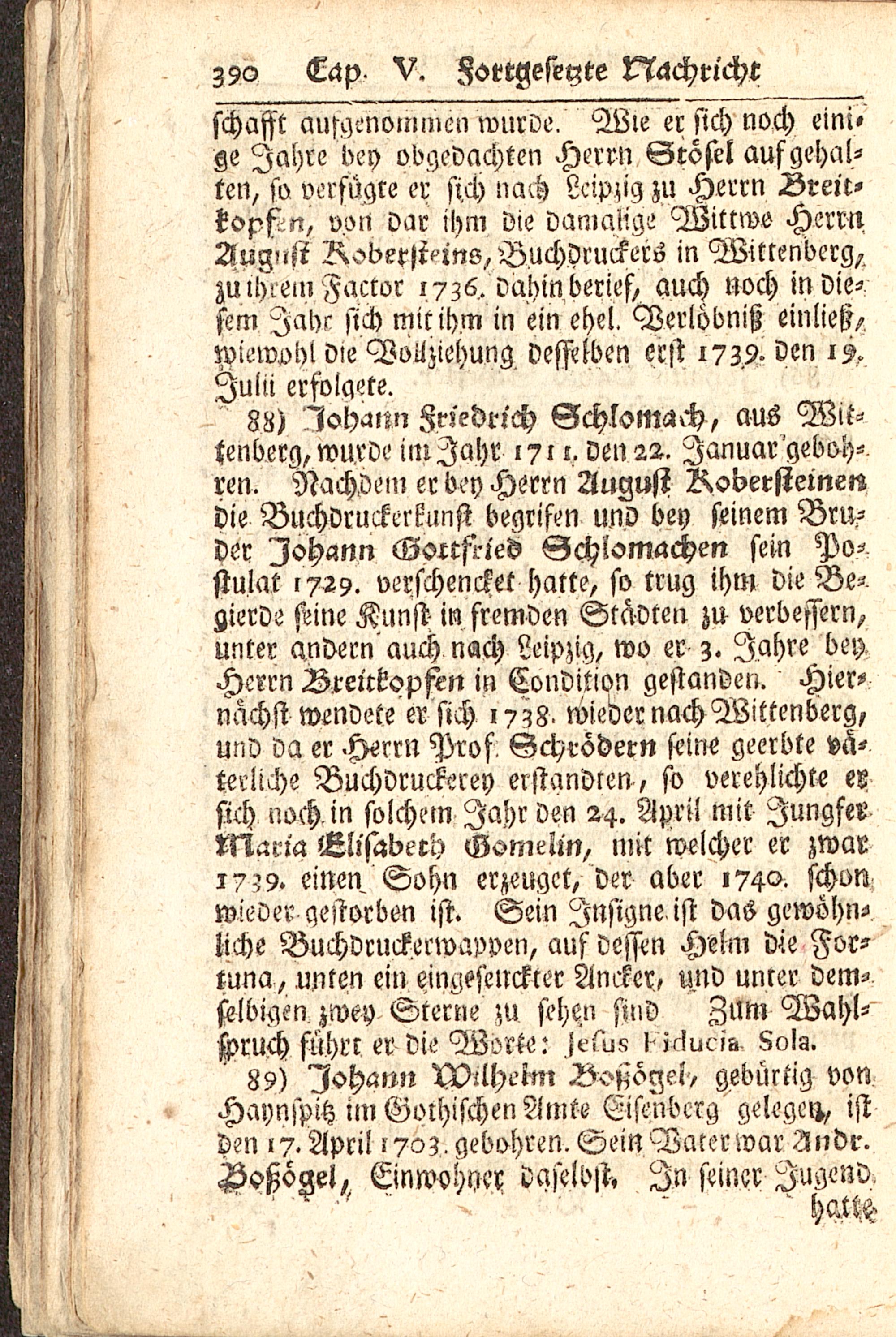 88) Iohuttn Friedrich Gchlom-zch, aus Wit-tenberg, wurde im Jahr 1711. den 22. Januar geboh-ren. Nachvein er bey Herrn August Robersteinendie Buchdruckerkunst begrifen und bey seinem Bru-der Ioh«nn Gottfried Gchlomachen sein Po-stulat 1729. verfchencket hatte, so trug ihm die Be-gierde seine Kunst m fremden Städten zu verbessern,unter andern auch nach Leipzig , wo er z. Jahre beyHerrn Breitl'opfen in Condition gestanden. Hier-nachst wendete er sich i? ?8> wieder nach Wittenberg ,und da er.Herrn Pros Schröder» seine geerbte vä-terliche Buchdruckerey erstandren, so verehlichte ersich noch in solchem Jahr den 24. April mit JungferkNaria Elisabeth Gomeim, mit welcher er zwar17?9. einen Sohn erzeuget, der aber 1740. schonwieder gestorben ist. Sein Jnsigne ist das gewöhn-liche Buchdruckerwappen, auf dessm Helm die For-tuna, unten ein eingesenckter Ancker, und unrer dem-selbigcn zwey Sterne zu sehen find Zum Wahl-jpruch führt er die Wort«:: i^lu« l>j<Iucib 8olg.