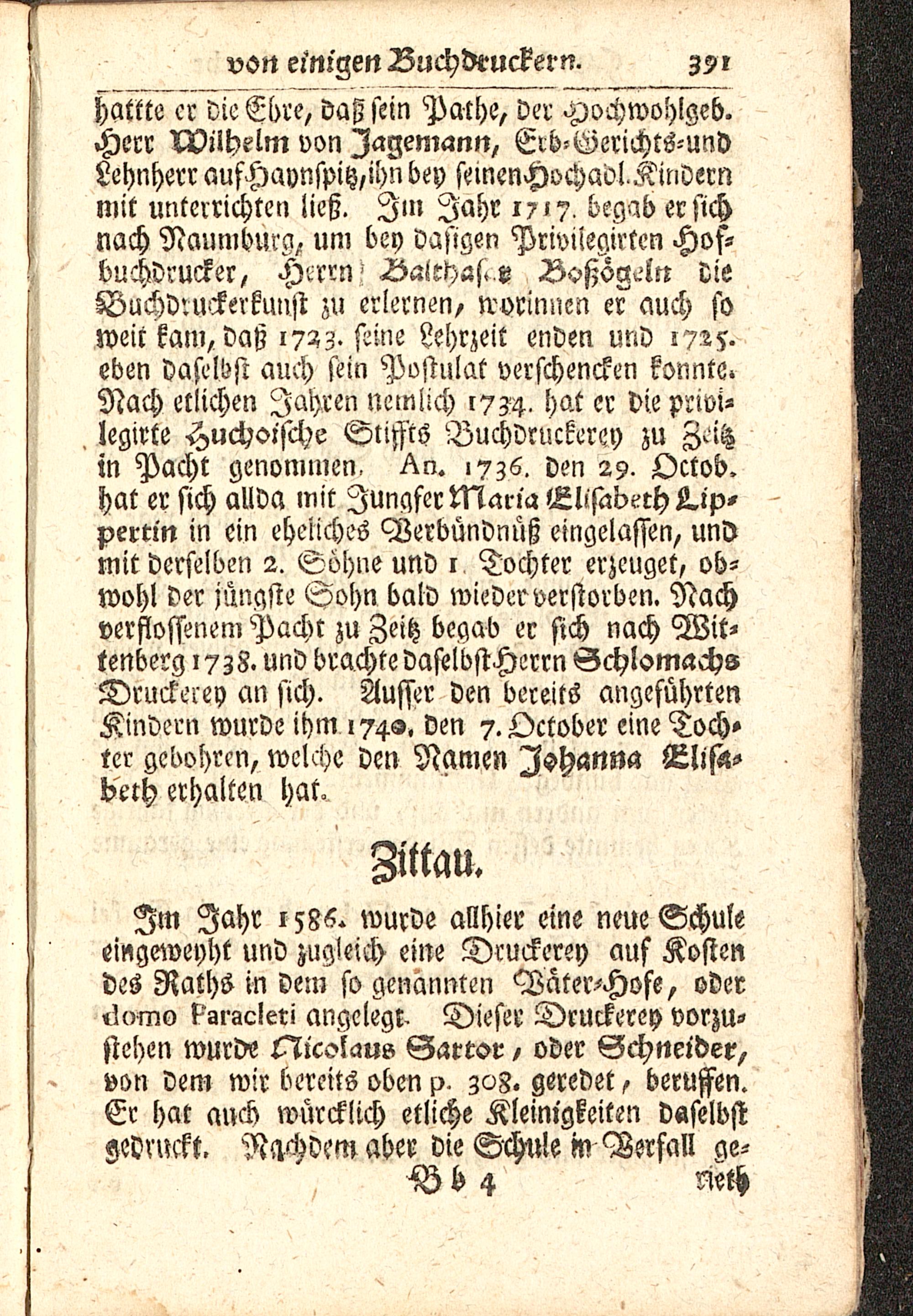 hattte er die Ebre, daß sein Pathe, der Hvchwohlgeb.Herr Wilhelm von Jagemann, Erb-Gerichts-undLehnherr aufHaynspitz,ihn bey semenHochaol.Kinvernmit unterrichten ließ. Im Jahr 17«7, begab er sichnach Naumburg, um bey vasigen Priviiegirten Hof-buchdrucker, H.rrn' Äa!rhss.,K 2Aoßög^ltt LiöBuchd'.uckerkunst zu erlernen, rrorinnen er auch soweit kam, daß 17??- seine Lehrzeit enden und 1725.eben daselbst auch sein Postulat verschencken konnte.Nach etlichen Jahren nemlich 17^4. hat er diepnvi-!egirte Huchoische Snffts Buchdruckerey zu A.itzin Pacht genommen, ^n. ,756. den 2?. Octob.hat er sich allda mit Jungfer Maria Elisabeth L.ip-pertin in ein eheliches Wervündnüß eingelassen, undmit derselben 2. Söhne und r Tochter erzeuget, ob-wohl der jüngste Sohn bald wieder verstorben. Nachverflossenem Pacht zu Zeitz begab er sich nach Wir-tenberg 1738. und brachte daftlbstHerrn GchlomachsDruckerey an sich. Ausser den bereits angeführtenKindern wurde ihm 174s. den 7.October eine Toch-ter gebohrm, welche den Namen Ishanna Elift-bech erhalten hat°