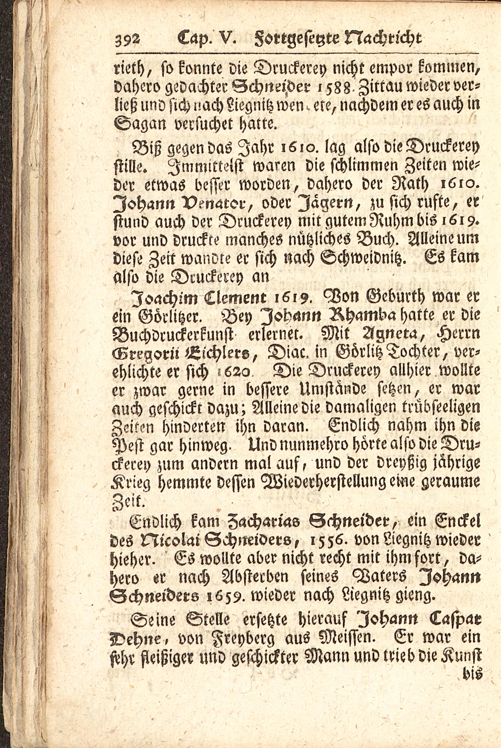 rieth, so konnte die Druckerey nicht empor kommen,dahero gedachter Schneider 1588 Zirtau wieder ver-ließ uns sich nach Liegnitz wen. ere, nachdem er es auch inSagan versuchet hatte.