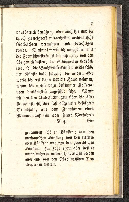 dankbarlich benutzen, aber auch hie und dadurch geneigtest mitgetheilte archivalischeNachrichten vermehren und berichtigenwerde. Dießmal werde ich mich allein mitder Formschneidekunst beschäftigen, von denübrigen Künsten, die Schöpperlin bearbei-tete, soll die Buchdrnckerkunst und die schö,ncn Künste bald folgen; die andern aberwerde ich erst dann vor die Hand nehmen,wann ich meine dazu bestimmte Kollecta-rieen hinlänglich angefüllt sehe. Wennich den bey Untersuchungen über die älte«sie Kunstgeschichte fast allgemein befolgtenGrundsatz, aus dem Zunahmen einesMannes auf fein oder seiner VorfahrenA 4 Ge,