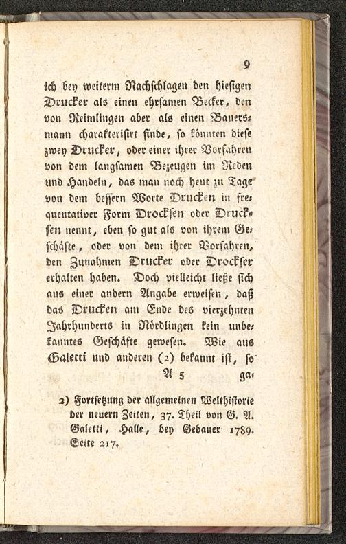 ich Sey weiterm Nachschlagen den hiesigenDrucker als einen ehrsamen Becker, denvon Reimlingen aber als einen Bauers-mann charaklerisirt finde, so könnten diesezwey Drucker, odereiner ihrer Vorfahrenvon dem langsamen Bezeugen im Ncdcnund Handeln, das man noch heut zu Tagevon dem bessern Worte Druck-n in fte-qucntaliver Form Drocksen oder Druck-sen nennt, eben so gut ais von ihrem Ge?schäste, oder von dem ihrer Vorfahren,den Zunahmen Drucker oder Drocksererhalten haben. Doch vielleicht ließe sichaus einer andern Angabe erweisen, daßdas Drucken am Ende des vierzehntenJahrhunderts in Nördlingen kein unbe-kanntes Geschäfte gewesen. Wie ausGalem und anderen (2) bekannt ist, soA 5 ga>