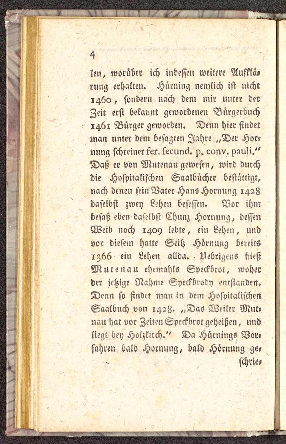 len, worüber ich indessen weitere Aufkla»rung erhalten. Hücning nemlich ist nicht1460, sondern nach dem mir unter derZeit erst bekannt gewordenen Bürgerbuch1461 Bürger geworden. Denn hier findetman unter dem besagten Jahre „Der Hör-nung schreiner fer. lecunä. p. conv. pzuU."Daß er von Mntenan gewesen, wird durchdie Hospualis'chen Saalbücher bestättigt,nach denen sein Vater Hans Hornung 1428daselbst zwey Lehen besessen. Vor ihmbesaß eben daselbst Chunz Hornung, dessenWeib noch 1409 lebte, ein Lehen, undvor diesem hatte Seih Hörnung bereitsiz6ü ein Lehen allda. UebrigenS hießMuten au ehemahls Speckbrot, woherder jetzige Nahme Speckbroty entstanden.Denn so finvet man in dem HospilalischenSaalbuch von 1428. „Das Weiler Mut»nau hat vor Zeiten Speckbror geheißen, undliegt bey Holzkirch ." Da Hürnings Vor»fahren bald Hornung, bald Hörnung ge,