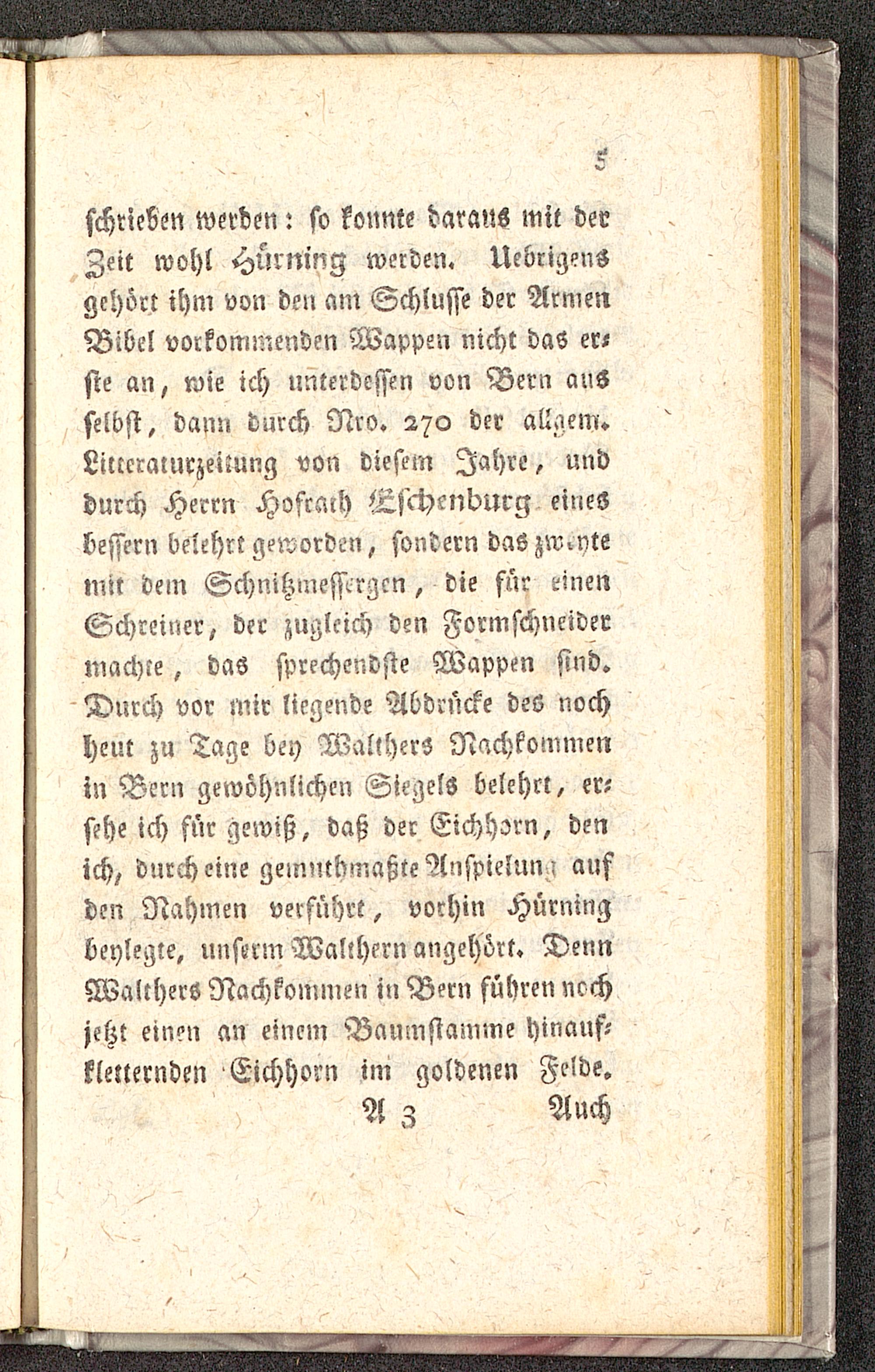 schrieben werden: so konnte daraus mit derZeit wohl Hmning werden. UebrigenSgehört ihm von den am Schlüsse der ArmenBibel vorkommenden Wappen nicht das er«sie an, wie ich unterdessen von Bern ausselbst, dann durch Nro . 270 der allgem.Lilleramrzei:ung von diesem Jahre, unddurch Herrn Hofrcuh Eschendurg einesbessern belehrt geworden, sondern daSzw.ntemit dem Schnitzmessrgcn, die für mienSchreiner, der zugleich den Formschneidermach!?, das sprechendste Wappen sind.Durch vor mir liegende Abdrücke des nochheut zu Tage bey Walthers Nachkommenin Bern gewöhnlichen Siegels belehrt, er-sehe ich für gewiß, daß der Eichhorn, denich, durch eine gemntkmaßte Anspielung aufden Nahmen verführt, vorhin Hürningbeylegte, unserm Wäschern angehört. DennWallherS Nachkommen in Bern führen nochjetzt einen an einem Baumstamme hinauf-kletternden Eichhorn im goldenen Felde.