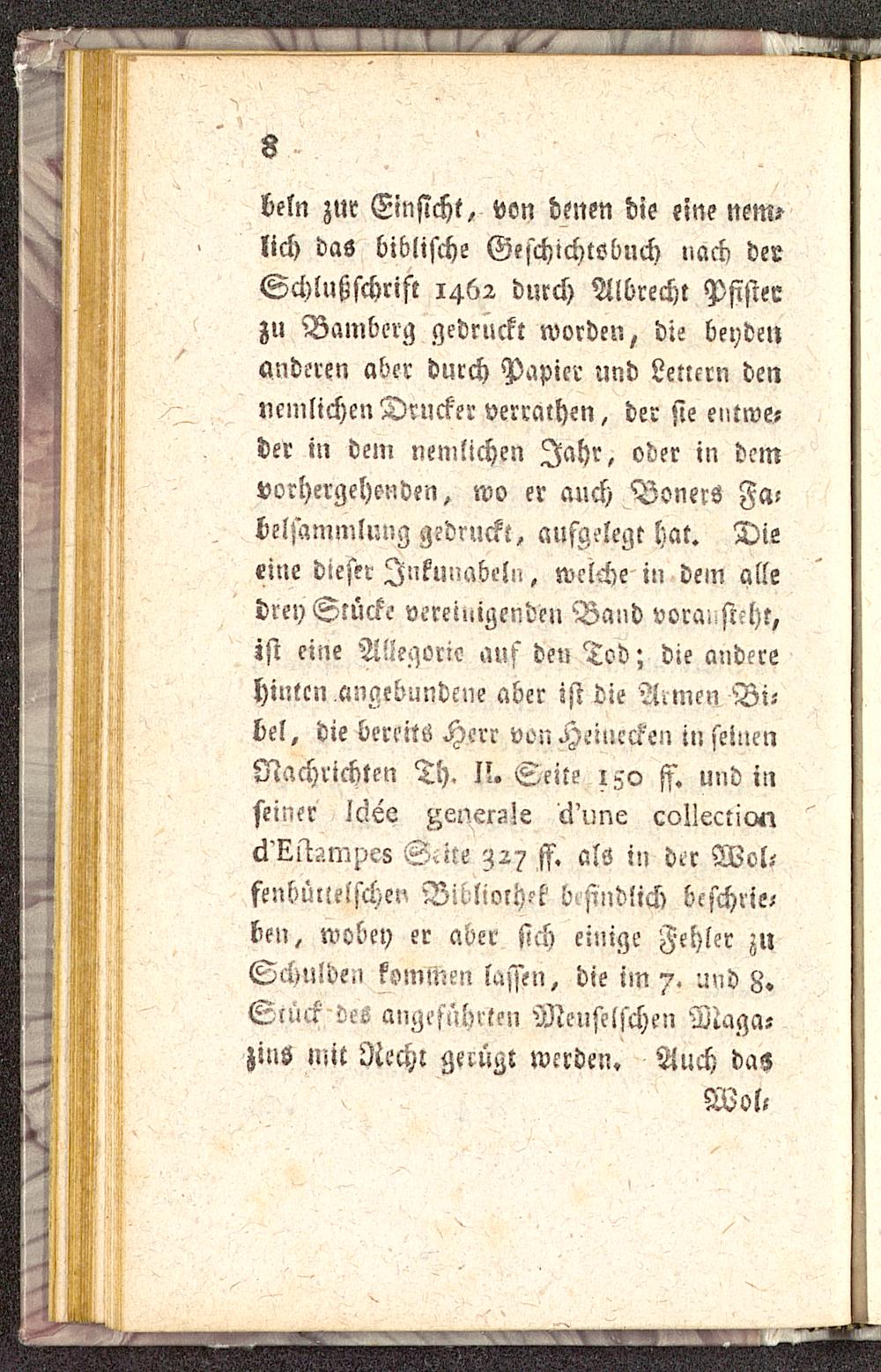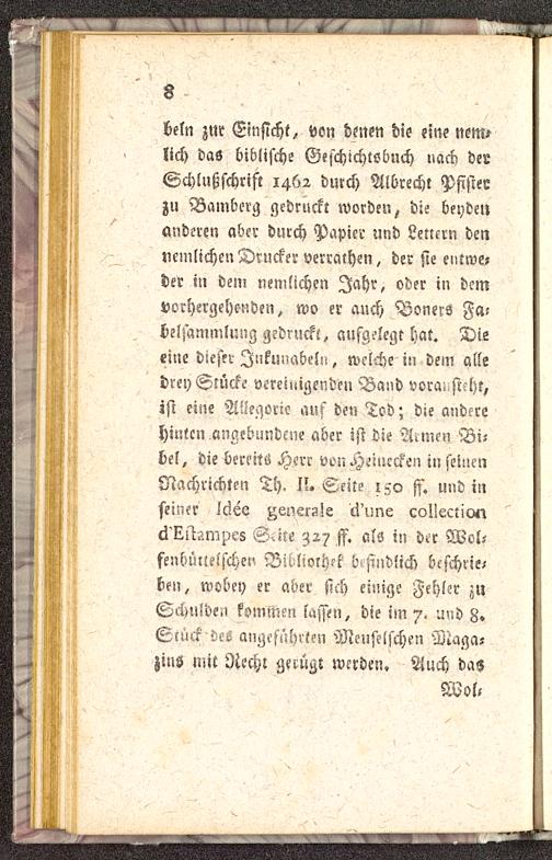beln zur Einsicht, von denen die eine nem?lich das biblische Geschichtsbuch »ach derSchlußschrift 1462 durch Albrecht Psisterzu Bambcrg gedruckt worden, die beydenanderen aber durch Papier und Lettern denucmlichen Drucker verrathen, der sie entwe-der in dein nenilichen Jahr, oder in demvorhergehenden, wo er auch BonerS Fa-belzammlung gedruckt, aufgelegt hat. Dieeine dieser Inkunabeln, welche in dein alledrey Stücke vereinigenden Band vora. sieht,ist eine Aüegoric auf den Tod; die anderehinten angebundene aber ist die Annen Bi-bel, die bereits Herr vonHeiuccken in seinenNachrichten Th. II. Seite 150 ff. und inseiner Ic?ee ^ener^s collectiv«ä'Ktt-^mpes Suce 327 ff. als in der Wol-fenbüllelschen Billiorh?t btsindlich bcschne,ben, wobey er aber sich einige Fehler zuSchulden kommen lassen, die im 7. und 8»Slück deö angeführten Menselfchen Maga-zins mit Recht gerügt werden. Auch das