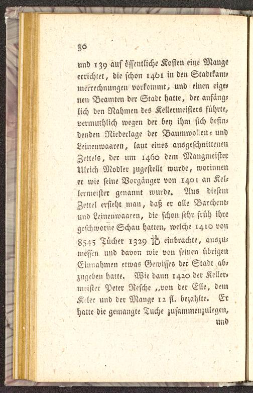 m,d i zy auf öffentliche Kosten eine Mangserrichtet, die schon 14dl in den Stadtkam-merrechnungen vorkomnit, und einen eige-nen Beamten der Sradt hatte, der anfäng-lich den Nahmen des Kellermeisters führte,vermuthlich wegen der bey ihm sich befin-denden Niederlage der Baumwo! en- undLeinenwaaren, laut eines ausgeschnittenenZettels, der um 1460 dem MangmeistecUlrich Modler zugestellt wurde, worinnener wie seine Vorgänger von 1401 an Kel-lermeister genannt wurde. Aus diesemZettel ersieht man, daß er alle Barchcnl-und Leincnwaaren, die schon sehr früh ihreg/schwornc Schau hatten, welche 1410 von854z Tücher 1Z29 A einbrachte, cmszu-wessen und davon wie von seinen übrigeuEinnahmen etwas Gewisses der Stadt ab,zugeben hatte. Wie dann 142Q der Keller»mnster Peter Resche „von der Elle, demK ler und der Mange 12 fl. bezahlte. Erhatte die gemangte Tuche zusammenzulegen,