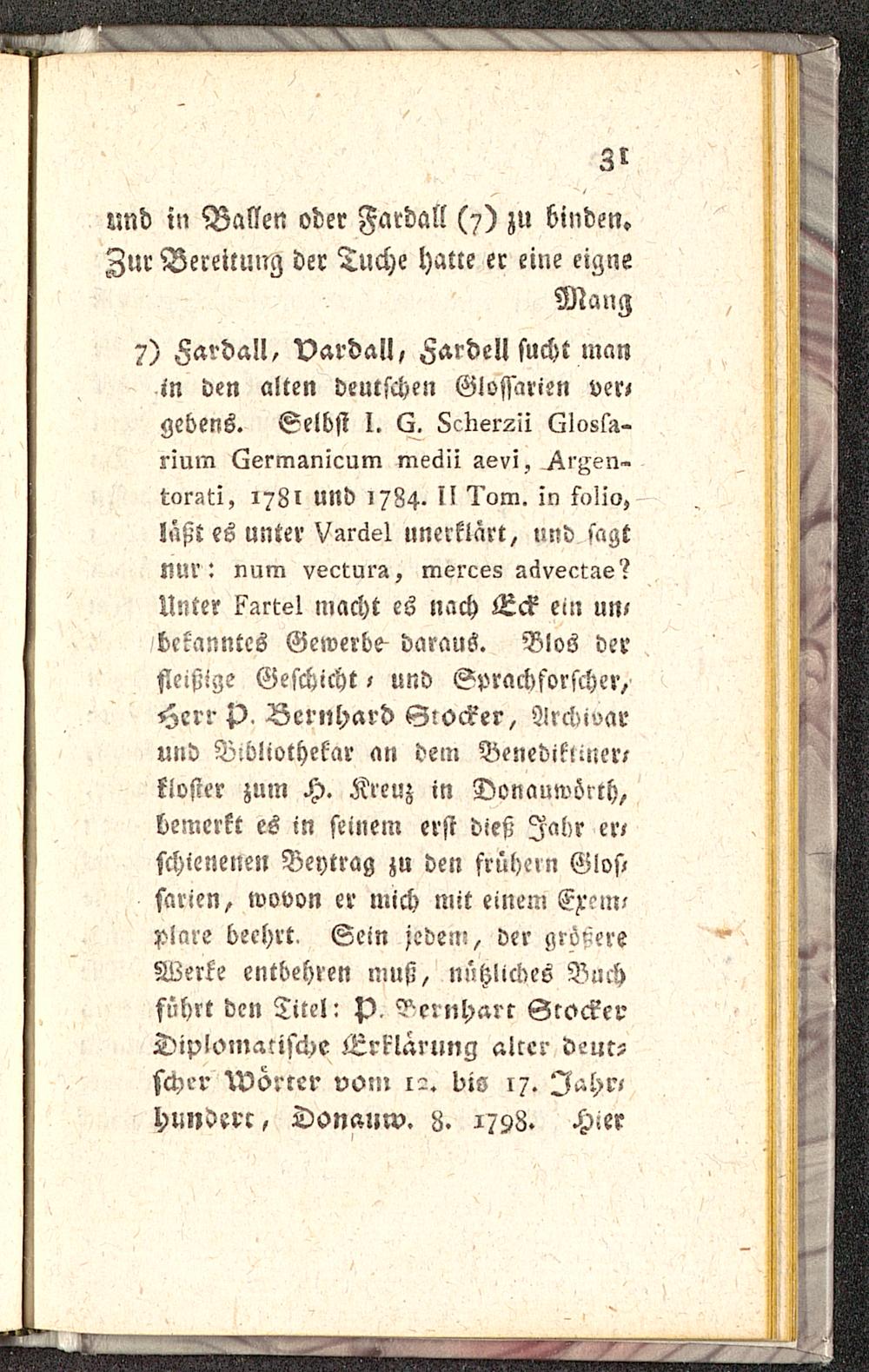 7) Fardall, Vardall, Zardell sucht manin den alten deutschen Glossarien ver,gebens. Selbst I. 6. LcKer^Ii Llossii-rium LermÄnicum meäii aevi, ^i^en»wrüti, 1781 UNd 1784. ll 1'om. m folio,läßt es unter Varäel unerklärt, und sagtnur : num vecturz, merces Äljvectae?Unter ^Al-tel macht es nach Eck ein UN«bekanntes Gewerbe- daraus. Blos derfleißige Geschieht, und Sprachforscher,Herr p, Bernhard G:oc?er, Archivarund Bibliothekar an dem Benedikimer,kivsier zum H. Kreuz in Donauwörrh,bemerkt es in seinem erst dies; Jahr er,schienenen Beytrag zu den frühern Glos-sarien, wovon er mich mit einem Excuuplnre beehrt. Sein jeden?, der grünereWerke entbehren muß, nützliches Buchführt den Titel: p, ^ernharr GrockcrDiplomatische Erklärung alccr d-ur?schrr Wörrer vom 12. bis 17. I^hr,hundert, Donanw. L. 1798. Hier