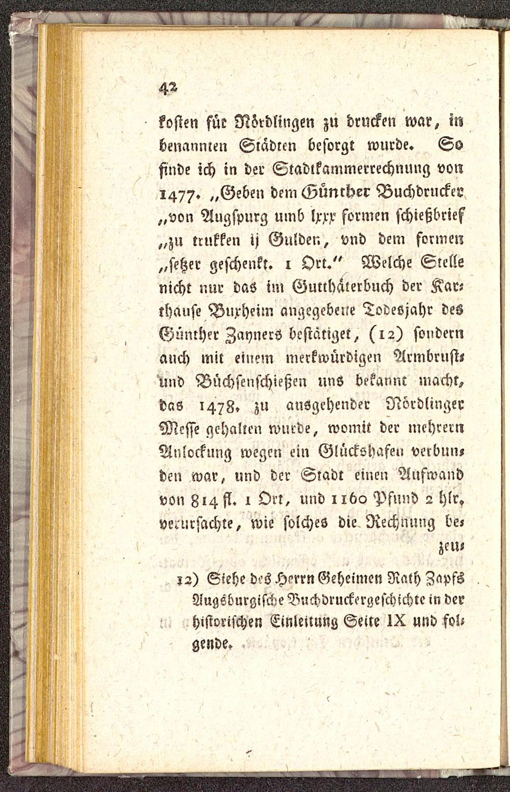 kosten für Nördlingen zu drucken war, inbenannten Slädrm besorgt wurde. Sofinde ich in der Stadlkammerrechnung von1477. „Geben dem Günrber Buchdrucker„von Augspurg umb lxxx formen schicßbrief„zu tcukken ij Gulden, vnd dem formen„setzer geschenkt, l Ort." Welche Stellenicht nur das im Gutthaterbuch der Kar-thause Buxheim angegebeile Todesjahr desGünther Zaynerö bestätiget, (^2) sondernauch mit einem merkwürdigen Armbrust«und Büchsenschießen uns bekannt macht,das 1478» zu ausgehender Nördlinger Messe gehalten wurde, womit der mehrernAnlockung wegen ein Glückshafeu verbun,den war, und der Stadt einen Aufwandvon 814 st. » Ort, und l ibo Pfund 2 hlr»verursachte, wie solches die Rechnung be,