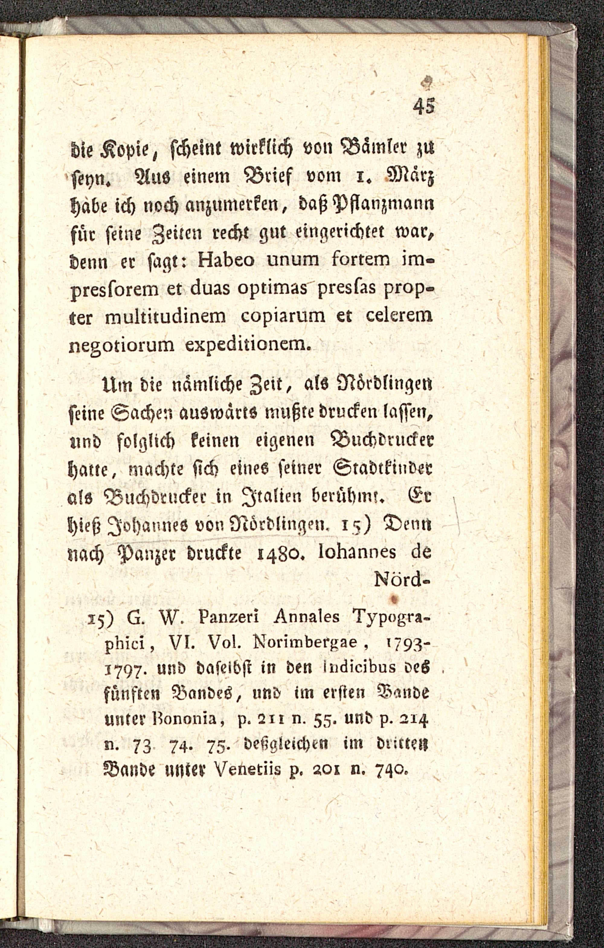 Um die nämliche Zeit, als Nördlingen seine Sachen auswärts mußte drucken lassen,und folglich keinen eigenen Buchdruckerhatte, machte sich eines seiner Stadtkinderals Buchdrucker in Italien berühmt. Erhieß Johannes von Nördlingen. 15) DennNach Panzer druckte 1480. lokarmes cls