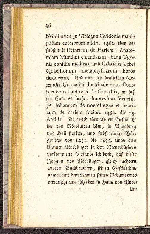 ^örälinZen zu Bologna Lyia'oms man!«xulum curatorum allein, 1482. eben dasselbst mir ^einricus 6e tZarlem: ^nzto^mi^m X^luncZini emen6atzm, dann l^Ac>°ni8 conliliz, meäicz; und Lzbrielis ^ebri(^.üiellionum metzpn^ücarum libros6uoclecim. Und mit eben demselben ^le-zi^n^ri (Zrsmztici 6c>ctrinz!e cum Lc>m-msmario I^uclovici 6e (ZuzscKis, an des-sen Lude es heißt: Impressum Venetiisper >c>nannem <5e noercllinAen et iienri-cum 6e nzrlem fc>cic>s. 148z. 6ie 2c./^prilis Ob gleich ehemals ein Geschlechtder vcm Nödlingen hier, in Augsburg und Hall floiirte, und selbst einige Bür-gerliche von 14zi. bis 149z. unter demNamen Nördliuger in den Steuerbücher»vorkommen: so glaube ich doch, daß dieserJohann von Nördlingen, gleich mehremanoern Buchdruckern, seinen GeschlechtS-uamen mit dem Namen seines Geburtsortesvertauscht und sich eben so Hans von Nörd,