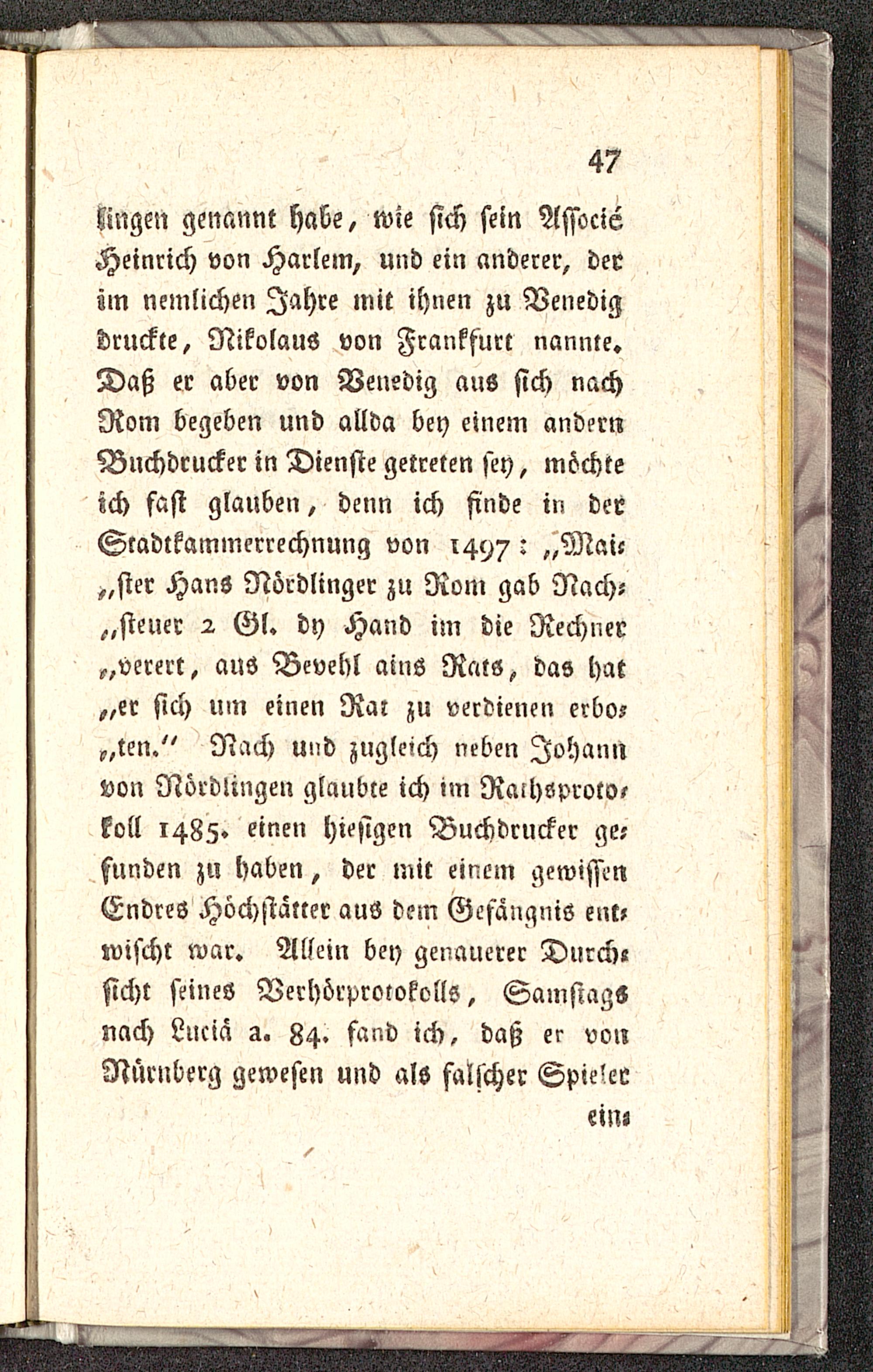 Augen genannt habe, wie sich sein AssocieHeinrich von Hartem, und ein anderer, dersm nemlichen Jahre mit ihnen zu Venedigdruckte, Nikolaus von Frankfurt nannte»Daß er aber von Venedig aus sich nachRom begeben und allda bey einem andernBuchdrucker in Diensie getreten sey, möchteich fast glauben, denn ich finde in derStadtkammerrechnung von 1497 ' „Mai-„ster Hans Nördlinger zu Rom gab Nach-„sieuer 2 Gl. dy Hand im die Rechner„verert, aus Bevebl ainS Rats, das hat„er sich um einen Rat zu verdienen erbv5„teil." Nach und zugleich neben Johannvon Nördlmgen glaubte ich im Ra-Hsprolo,koll 1485. einen hiesigen Buchdrucker ge-funden zu haben, der mit einem gewissenEndreS Höchsiätler aus dem Gefängnis ent-wischt war. Allein bey genauerer Durch-sicht seines Verhörprocokolls, Samsiag«nach Lucia z. 84. fand ick, daß er vonNürnberg gewesen und als falscher Spieler